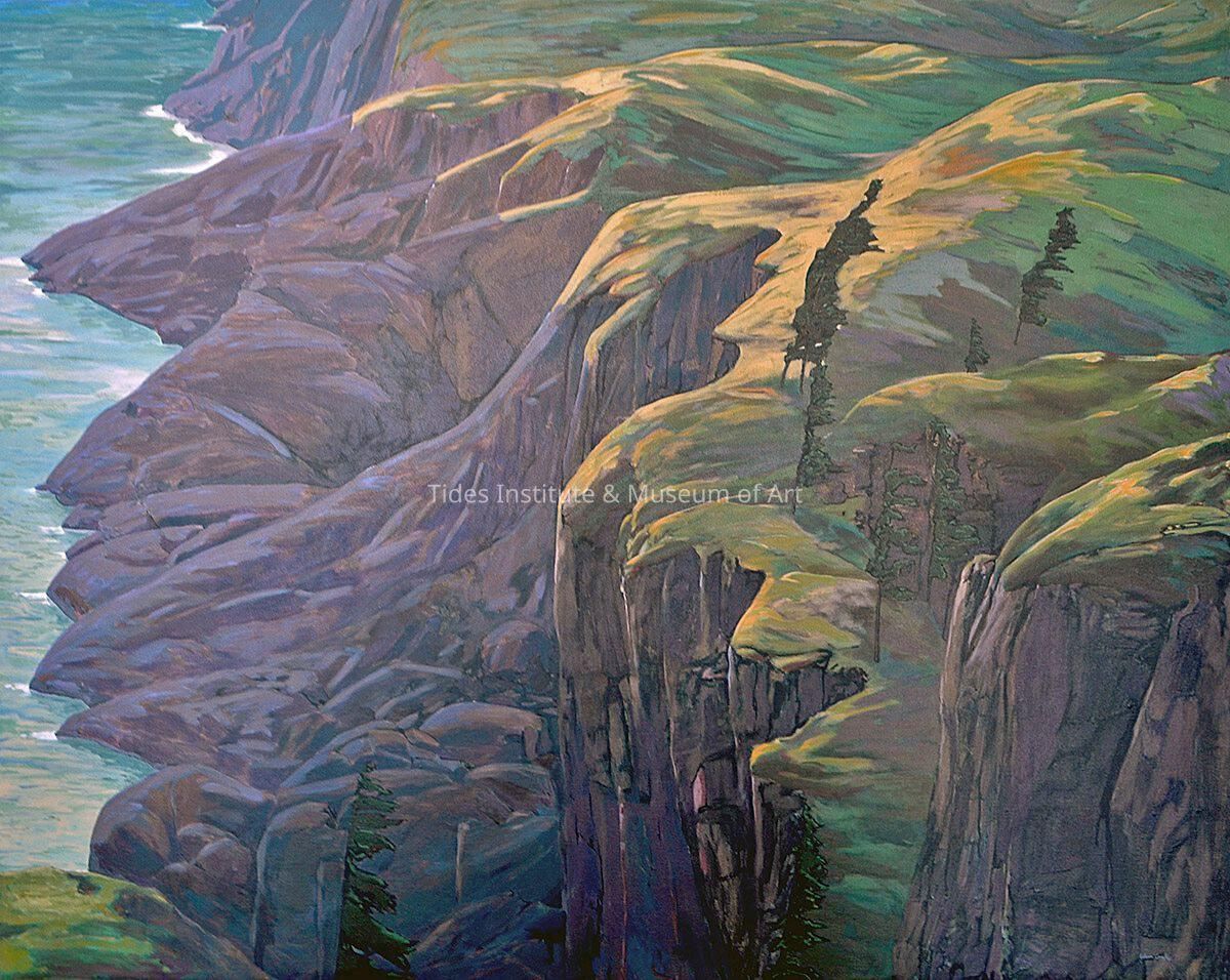 A large (48 x 60 inches) acrylic on canvas painting of the cliffs of Grand Manan island in New Brunswick by Canadian artist, John Doyle, that dates to 1994. It gives a dramatic view from the northeast of Grand Manan looking out along the cliffs towards Swallowtail Lighthouse. The Tides Institute discovered the painting in Toronto, Ontario in the art gallery, Gallery One, that represented Doyle at that time. The institute was able to raise the necessary funds to purchase the painting directly from the gallery. John Doyle was born in Toronto in 1950 and earned a degree in fine arts at York University in Toronto in 1974. Primarily a landscape painter, Doyle’s work has focused on the central Canadian province of Ontario, but he has, on occasion as witnessed by his painting of the cliffs of Grand Manan island, ventured to the east coast of Canada as well as western Canada and outside of Canada, too. His paintings tend to be large scale and mostly acrylic on canvas. His work has been exhibited almost exclusively in Toronto though he did have a solo exhibition at the New Brunswick Museum in Saint John, New Brunswick in 1983. Most of his paintings are less dramatic than his painting of the cliffs of Grand Manan island, but the reasons for this have more to do with choice of subject matter, more serene forested and rural scenes though some times with more vibrant colors.