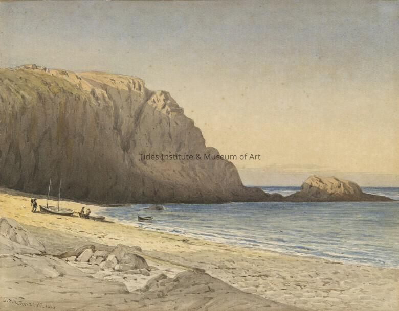 A watercolor painting by American artist, Samuel Peter Rolt Triscott, of Eel Brook Beach and Ashburton Head on Grand Manan Island, New Brunswick. It dates to about 1890. Triscott was born in Gosport, England in 1846, one of five children, to a relatively well off family. His early art studies in painting were at the Royal Institute of Painters in Water Colors in London. But he was also trained in civil engineering. In 1871 Triscott moved to Worcester, Massachusetts and became a partner in a civil engineering firm there. Three years later he began selling his painting out of his engineering office and in 1881 he had he had a one person exhibition at the Boston Art Club in Boston. He continued to show regularly at this Club as well as the American Watercolor Society in New York, the Pennsylvania Academy of Fine Arts in Philadelphia and the Gallery of J. Eastman Chase in Boston. Triscott taught painting during this time and his students included Winslow Homer, Sears Gallagher, William J. Bixbee, and Robert Henri. In 1885, he helped found, along with others, the Boston Society of Water Color Painters. Triscott first began to visit Monhegan Island in mid-coast Maine in the early 1890s. There he bought a large tract of land, parts of which he later sell off as cottage lots as Monhegan became more popular as a summer destination. As time went on, Triscott spend more of each year on Monhegan and eventually began staying there year round. It was during his Monhegan years that Triscott visited Grand Manan. He died on Monhegan in 1925. This watercolor was acquired by the Tides Institute at auction in 2014.
