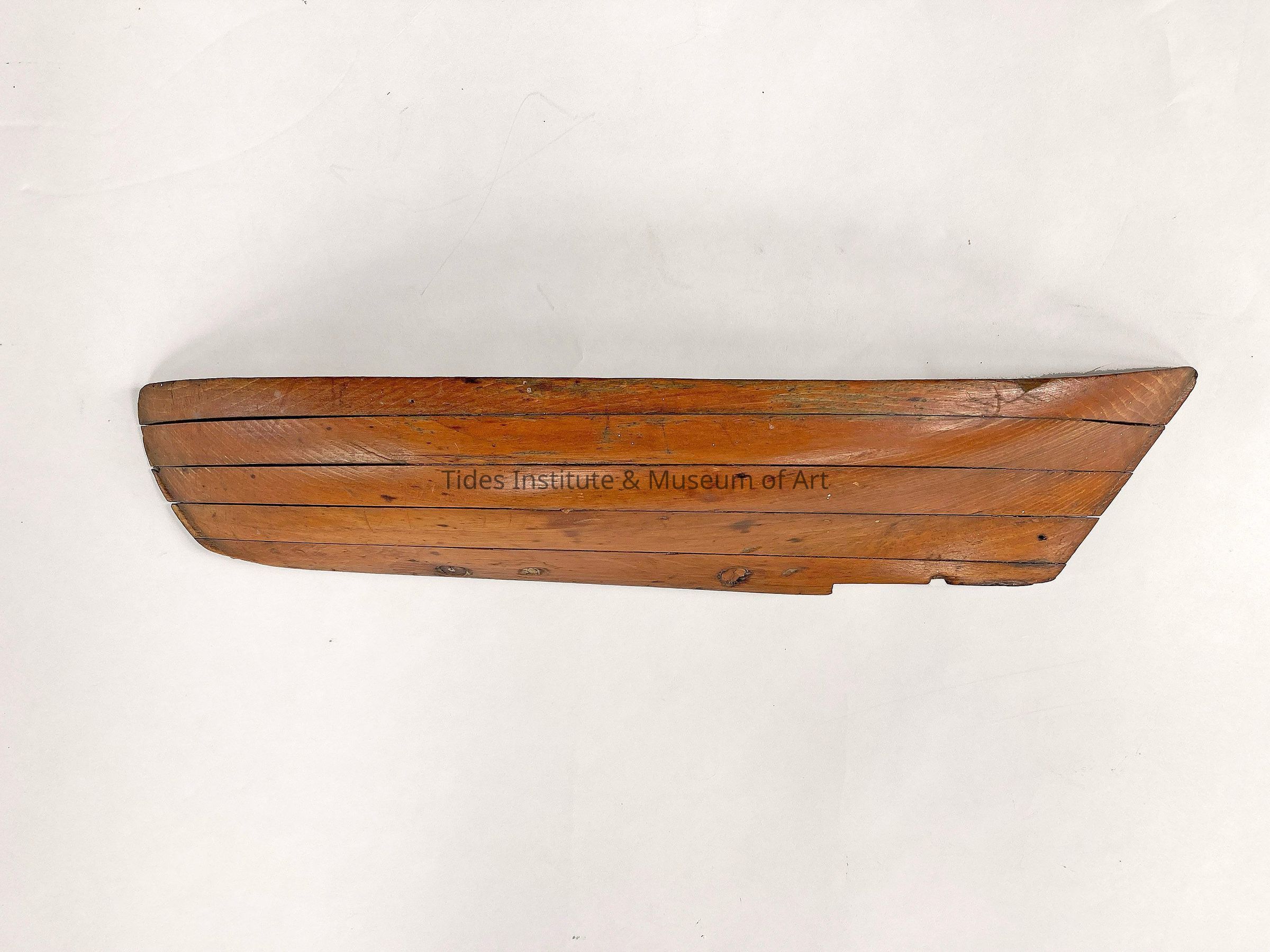 Original half model of a two masted pinky schooner that was built in Lubec, Maine. 15 3/8" in length. Also donated at the same time was a full model of a pinky schooner, based on this same half model, and made by Jerome Andrews' grandfather, Edward Tewksbury of Deer Island, New Brunswick.