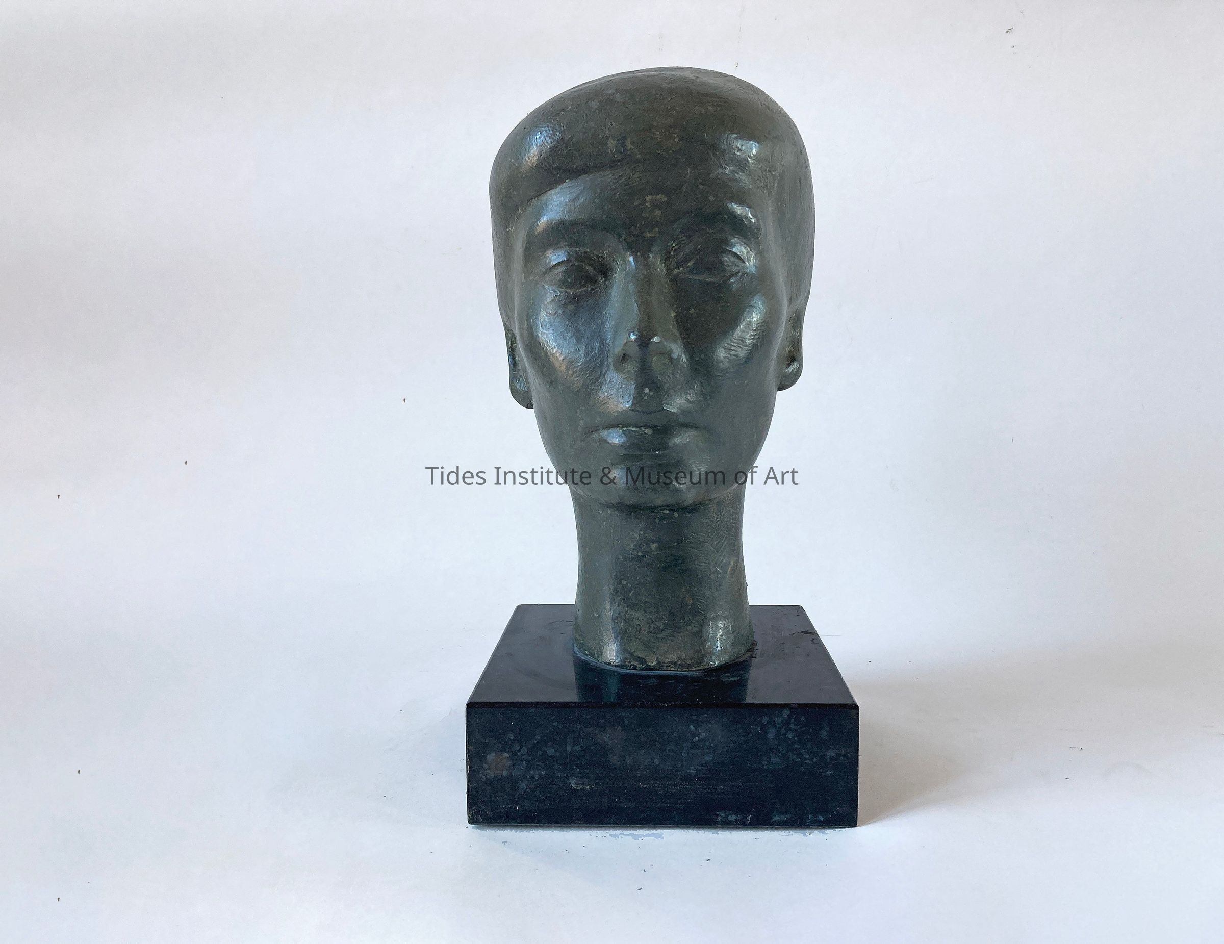 A bronze cast sculpture head of a woman's head by artist Helena Simkhovitch. The sculpture dates to the 1950s. The sculpture was a gift from the artist's son. It is part of a collection of nine works of sculpture by Simkhovitch in the collections of the Tides Institute. Simkhovitch was born in New York City in 1903, attended Bryn Mawr College and lived from 1925 to 1937 in Paris where she studied art and sculpture with Charles Despiau, Aristide Maillol and at the Academie Colarossi with Marcel Gimond. From 1940 on she lived and worked in New York City and Maine. Her works have been exhibited in Paris, the American Federation of Arts, Whitney Museum of American Art, the Federation of Modern Painters and Sculptors, the Sculptors Guild, Newark Museum, Pennsylvania Academy of Fine Arts, Maine and St. Stephen, New Brunswick. In 1955, the Museum of Modern Art organized a traveling exhibition devoted to modern portraits, in which Helena Simkhovitch was the only American. Her awards include the Palmes Academiques and Officer de l’Instruction Publique. Her roots in this region go back to her childhood when she would come to Perry with her parents and grandparents in the summer. Later, she and her husband summered at the Mansion House in Robbinston with her parents, Mary and Vladimir Simkhovitch, from New York City. From the 1960s onwards, she and her husband lived year round in Maine, first at the Mansion House, then in Machias. She died in 1993.