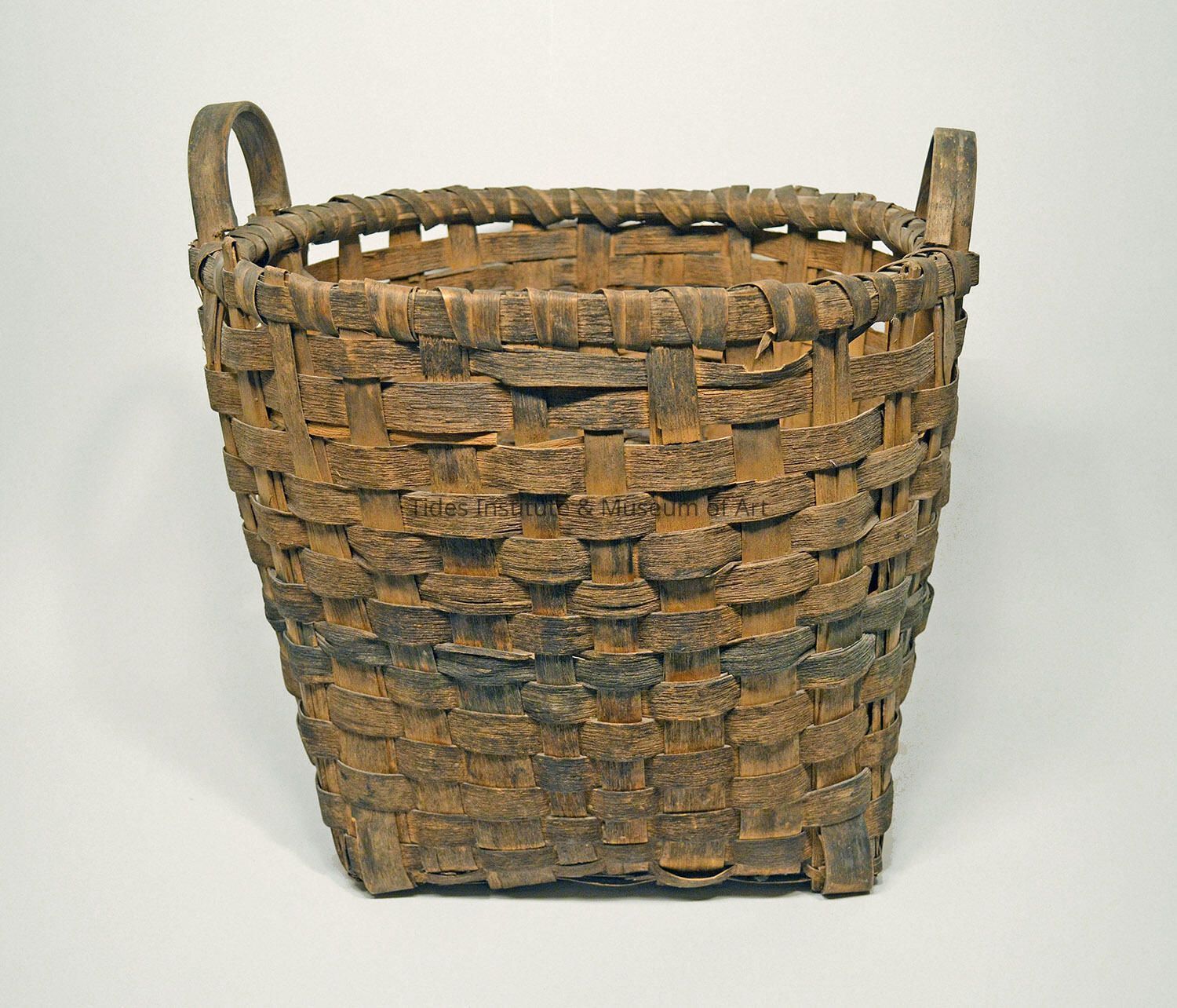 A large late 19th century herring basket made by the Passamaquoddies. It stands about 15” tall by about 19” in diameter. Made of woven strips of ash with an ash wood handle, thousands of such baskets were used in the fishing and particularly the sardine industry of the northeastern coast of Maine and southwestern coast of New Brunswick in the late 19th and early 20th centuries. Many were brought by canoes to the sardine factories from the nearby Passamaquoddy communities. The baskets were used to transport freshly caught herring from the holds of small sail powered carrier boats that brought the herring from where they had been caught in fish weirs to the sardine factory wharves. There the herrings were brought from the boats to the wharf decks one basket at a time using a simple hand pulled pulley and rope system. The baskets of fish were then dumped on tables where the heads of the herring were cut off by young laborers using large knives. The cut herring bodies were then poured back into baskets and lugged by hand to the next step in the then very labor intensive process of turning herring into canned sardines. This herring basket example is rare as few survived once the sardine industry became much more mechanized early in the 20th century and such baskets were no longer needed. Later the 20th century, such baskets were used by the thousands once again to deliver herring scales by boat to the newly developing pearl essence industry in the region that used herring scales in the production of such products as nail polish. Examples of these later herring baskets are much more common and are often marked with a large letter on the side of the basket to denote which pearl essence factory the basket belonged. The earlier late 19th century herring basket was found for sale on eBay by a seller in Quebec and purchased by the Tides Institute for its collections. When the basket arrived at the institute, it still had a few herring scales attached to the ash strips of the basket.