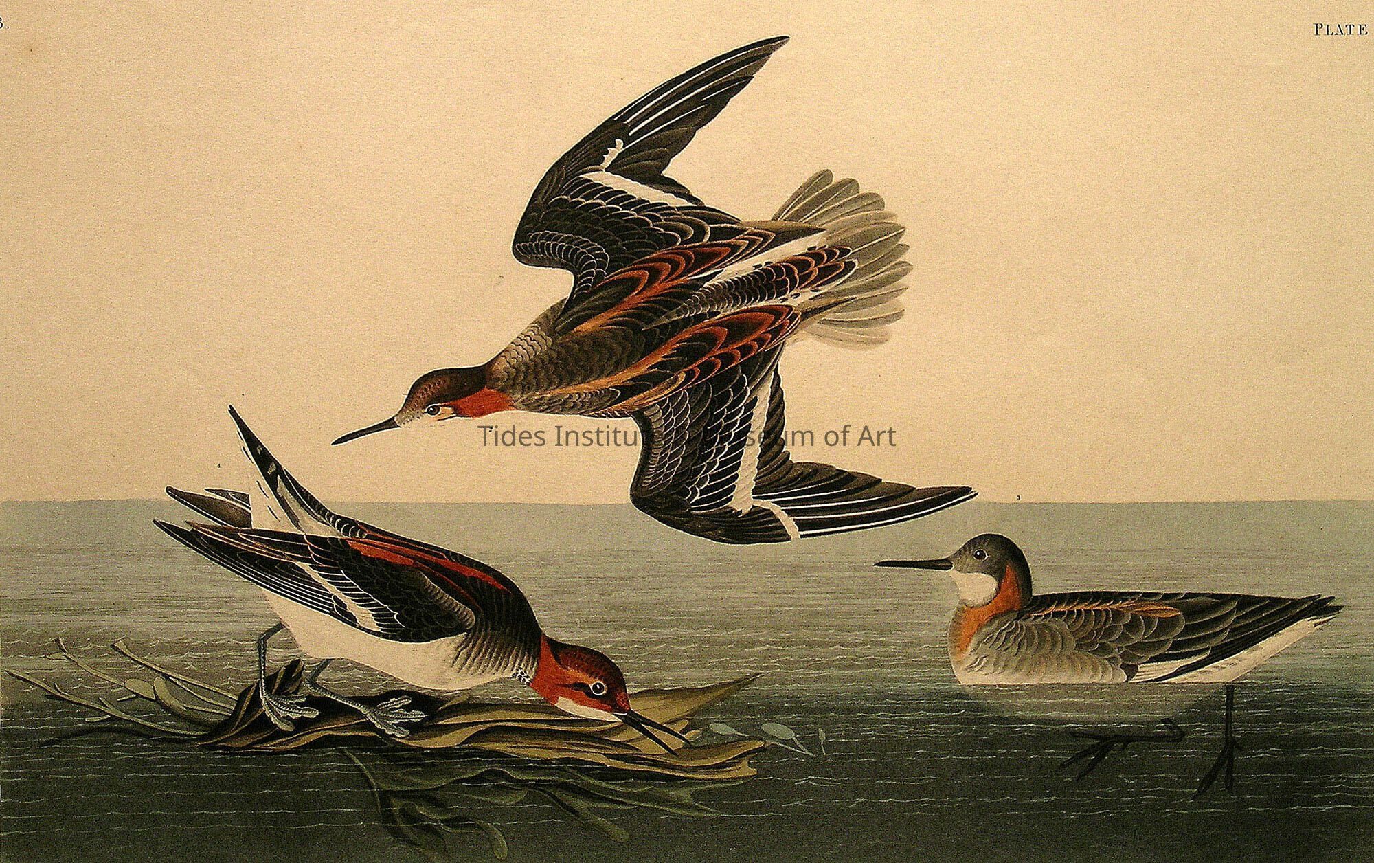 A large hand-colored engraving and aquatint by American artist and naturalist, John James Audubon (1785-1851), of a Hyperborean Phalarope. The print is based on a watercolor Audubon completed from a drawing he did of the bird in this border region during one of his two trips to the area in 1831 and 1833 on his way to Labrador. Audubon observed and drew several birds during his time in the area where he stayed in Dennysville and Eastport, Maine and visited Grand Manan, New Brunswick and the Fundy shore of Nova Scotia. In addition to the Hyperborean Phalarope, the other drawings included the Lincoln Sparrow (named for Audubon’s Thomas Lincoln of Dennysville), Harlequin Duck, and Thick Billed Murre. The Hyperborean Phalarope print (19 3/4”/50.2 cm x 12 1/4”/31.1 cm) is Plate CCXV of Audubon’s massive Birds of North America that contains 435 life-size watercolors by Audubon of North American birds (including the birds drawn in this area) printed between 1827 and 1838, all reproduced from hand-engraved plates by Robert Havell. The Hyperborean Phalarope was engraved and printed in 1834. The Tides Institute acquired the print at the Heritage Auction in Dallas, Texas and raised the necessary funds to secure the print. At the time of his encounters with the Hyperborean Phalaropes, Audubon wrote: “As we advanced eastward in the month of May, we saw more and more of them, and while at Eastport in Maine my son JOHN shot several out of flocks of sixty or more. At one time a flock consisting of more than a hundred was seen in the Bay of Fundy. They were exceedingly shy, and the gunners of Eastport, who knew them under the name of Sea Geese, spoke of them as very curious birds.”