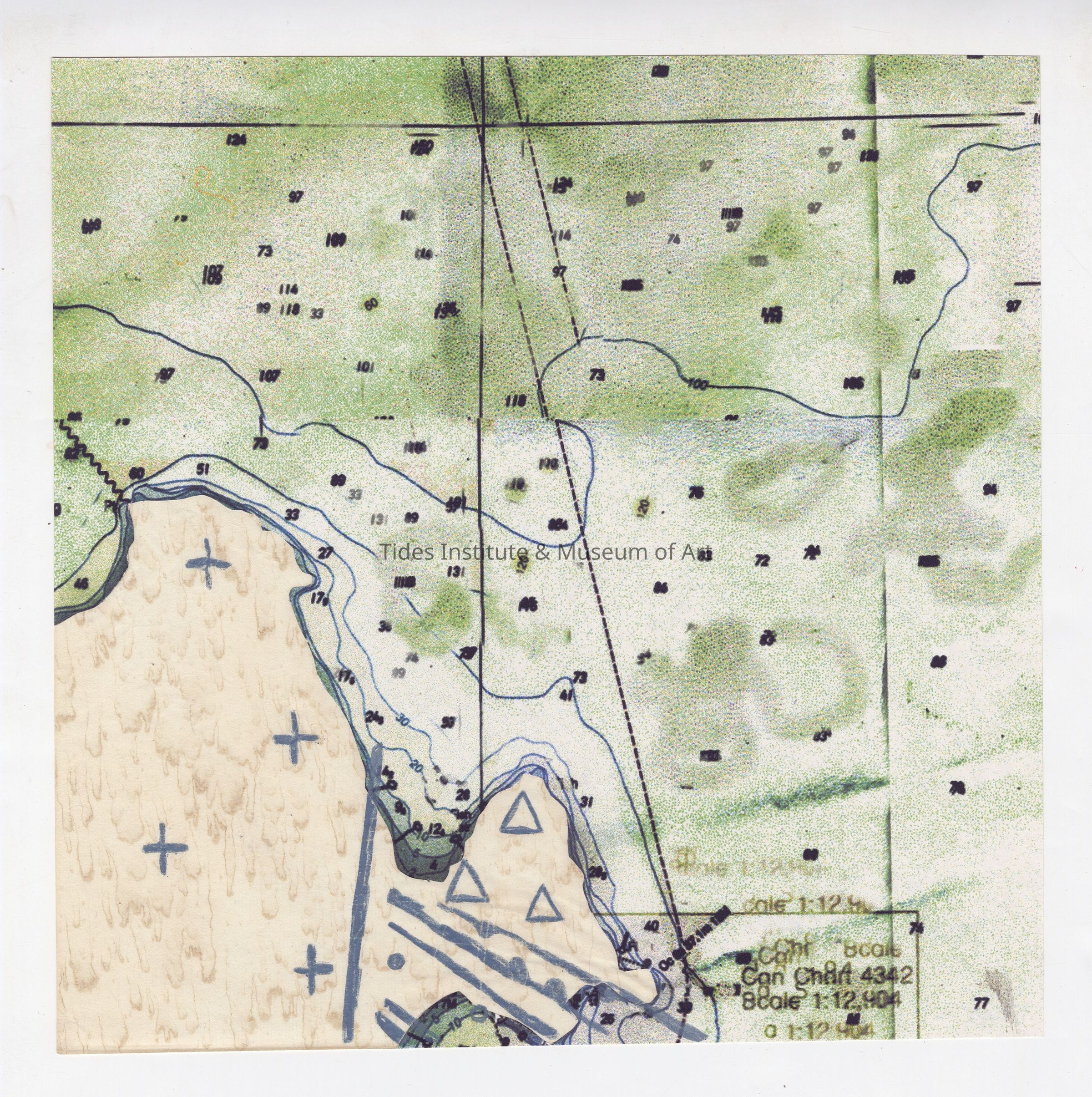 Ian Carlson (digital print, stencil, chin-collé) – The alterations to my particular quadrant were sampled from a local map of geologic formations. Each symbol represents a different composition of rock and/or mineral deposits. I have removed the terrain from the original map and replaced it with this geological information.