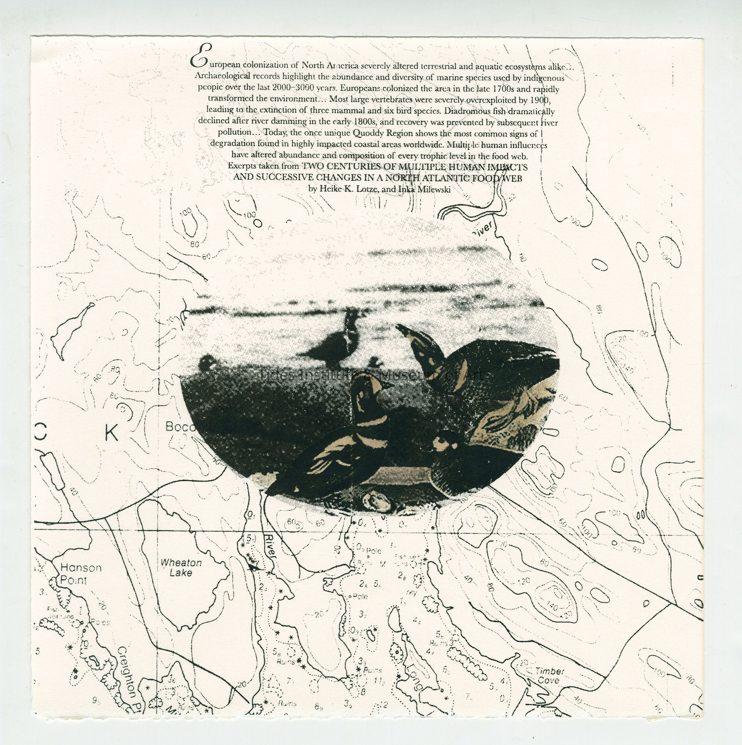 Julianna Swaney (screenprint) – With human presence comes an inevitable change in the biodiversity of a place. The Harlequin Duck, represented here, is one species whose numbers are decreasing in this area.