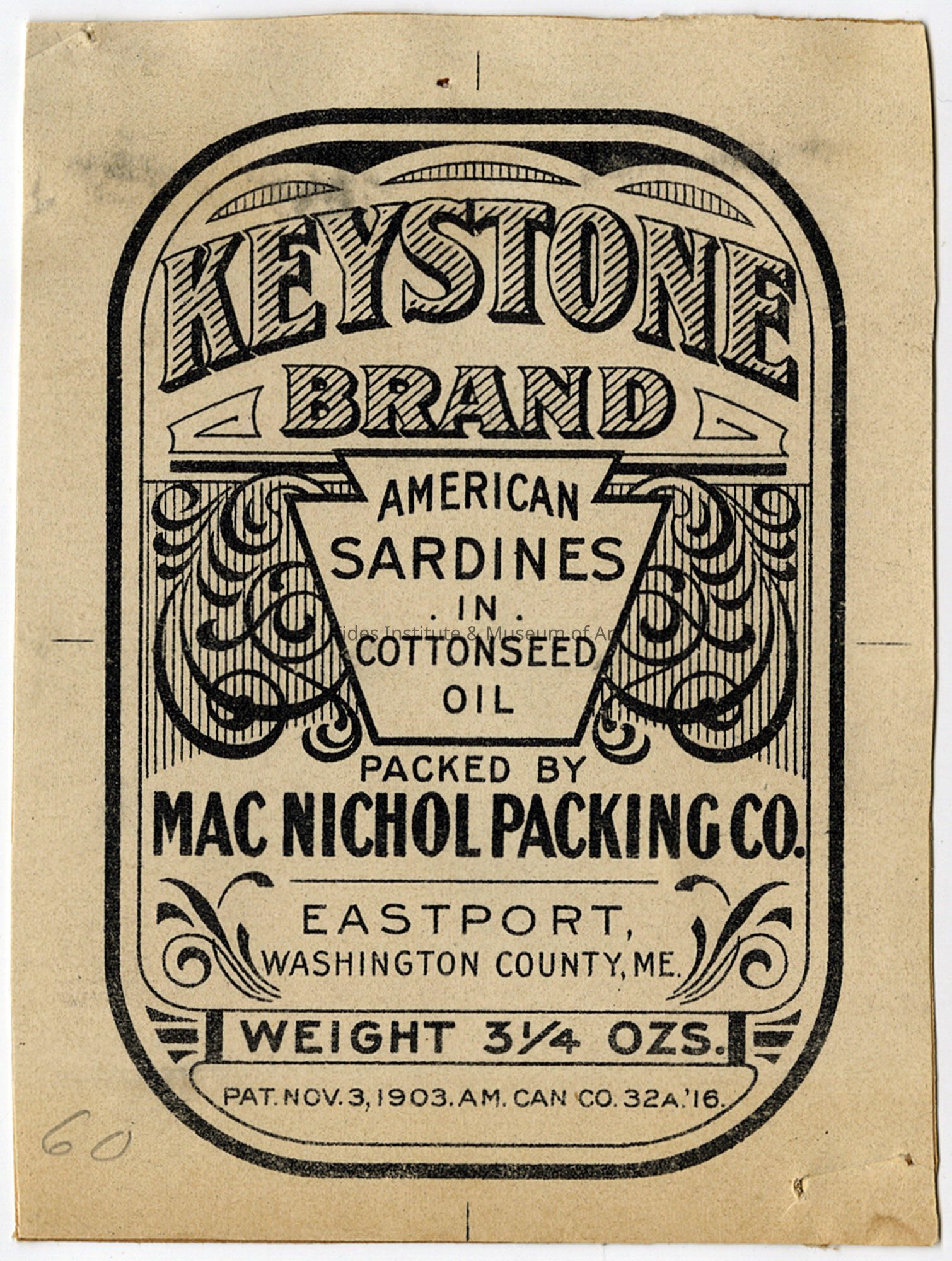 Old Accession Number: 813 Circa: 1903 Description: Packed by Mac Nichol Packing Co. In U.S.A. Eastport Washington County, ME.