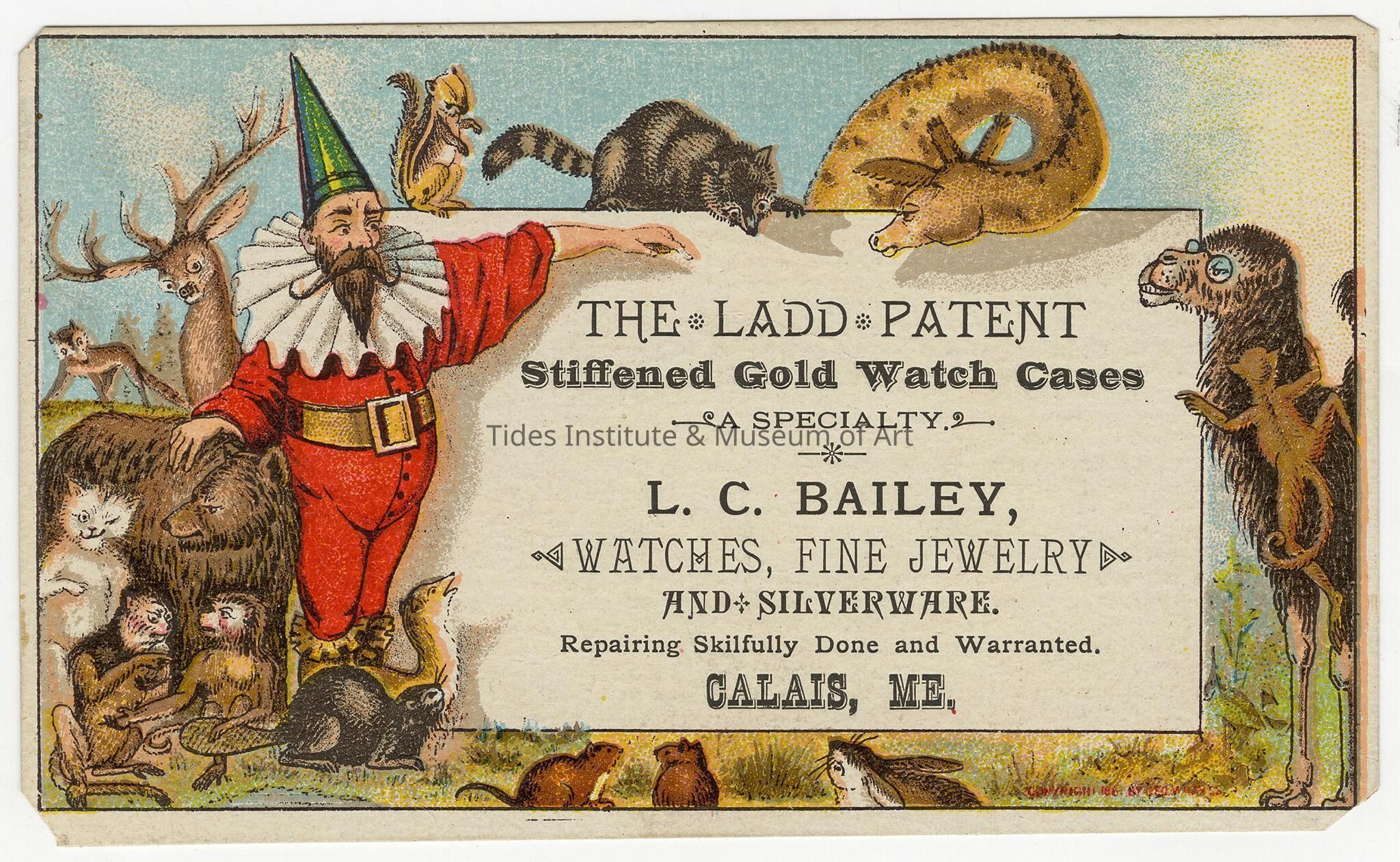 TRADE CARD, CALAIS, C.1875! Wonderfully designed and very colorful 19th century trade card in our collections for L.C. Bailey, jeweler and silversmith, of Calais, Maine. We're guessing the card dates to about 1875. We also have a number of mid to late 19th century silver spoons in our collections with the mark of L.C. Bailey.