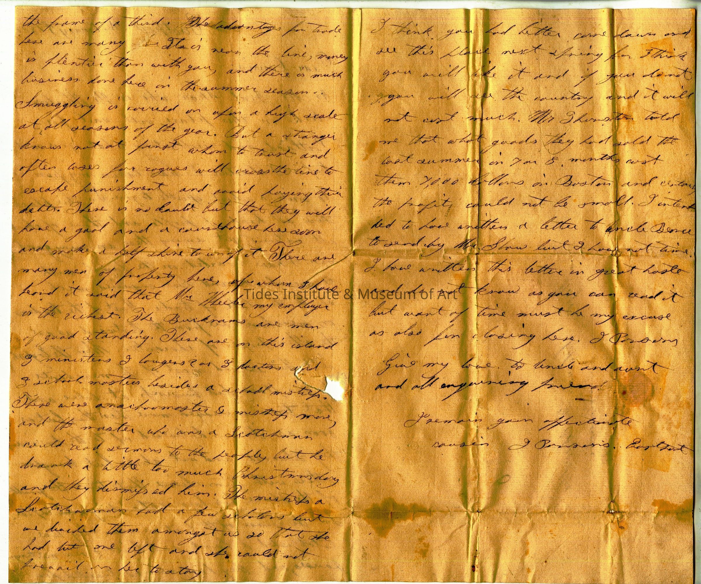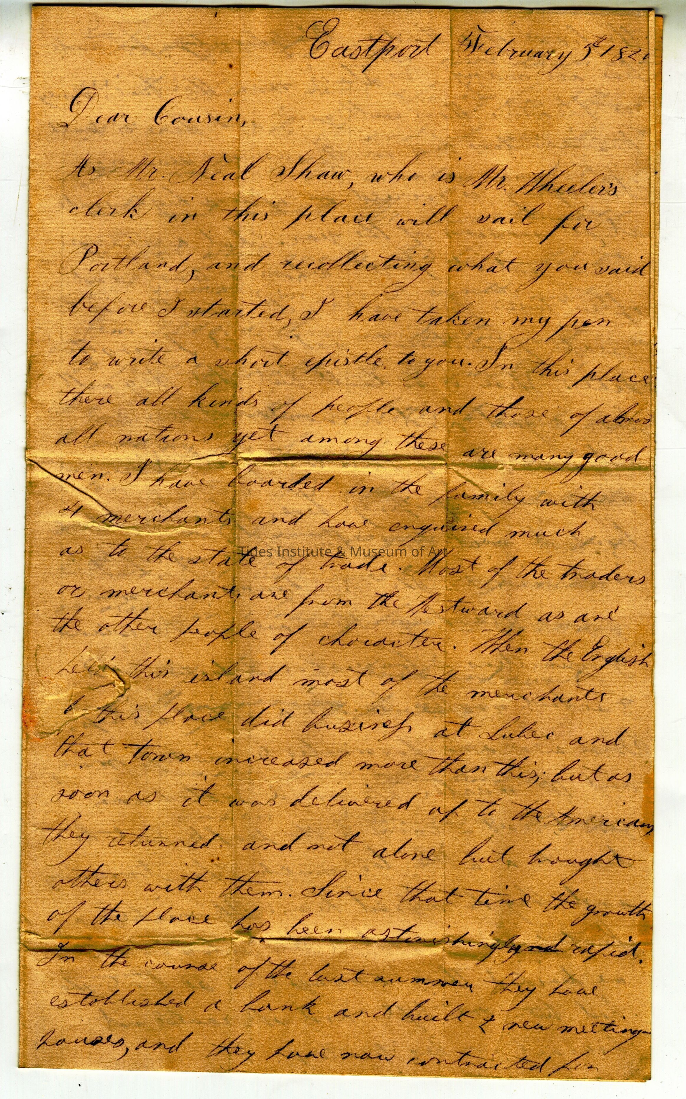 Dear Cousin, As Mr. Neal Shaw, who is Mr. Wheeler’s clerk in this place will sail for Portland, and recollecting what you said before I started, I have taken my pen to write a short epistle to you. In this place there all kinds of people and those of almost all nations yet among these are many good men. I have boarded in the family with 4 merchants and have enquired much as to the state of trade. Most of the traders or merchants are from the Westward as are the other people of character. When the English held this island most of the merchants of this place did business at Lubec and that town increased more than this, but as soon as it was delivered up to the Americans they returned and not alone but brought others with them. Since that time the growth of the place has been astonishingly rapid. In the course of the last summer they have established a bank and built 2 new meeting houses, and they have now contracted for the frame of a third. The advantages for trade here are many. It is near the line, money is plentier than with you, and there is much business done here in the summer season. Smuggling is carried on upon high scale at all seasons of the year. But a stranger knows not at first whom to trust and often loses for rogues will cross the line to escape punishment and avoid paying their debts. There is no doubt but that they will have a gaol and a courthouse here soon and make a half shire town of it. There are many men of property here, of whom I have heard it said that Mr. Wheeler my employer is the richest. The Bucknams are men of good standing. There are on this island 3 ministers 2 lawyers 2 or 3 doctors and 3 school masters besides a school mistrefs. There master & mistrefs more and the master who was a Scotsman who could read sermons to the people But he drank a little too much Christmas Day and they dismifsed him. The mistrefs a Scottish woman had a few scholars but we divided them amongst us so that she had but one left and she could not prevail on her to stay. I think you had better come down and see this place next spring for I think you will like it and if you do not you will see the country and it will not cost much. Mr. Thuston told me that what goods they had sold the last summer in 7 or 8 months cost them 7,000 dollars in Boston and certainly The profits could not be small. I intend to have written a letter to Uncle Pence to send by Mr. Shaw but I have not time. I have written this letter in great haste and do not know as you can read it but want of time must be my excuse as also for closing here. J Parsons Give my love to to uncle and aunt and all enquiring friends. I remain your affectionate cousin J Parsons, Eastport