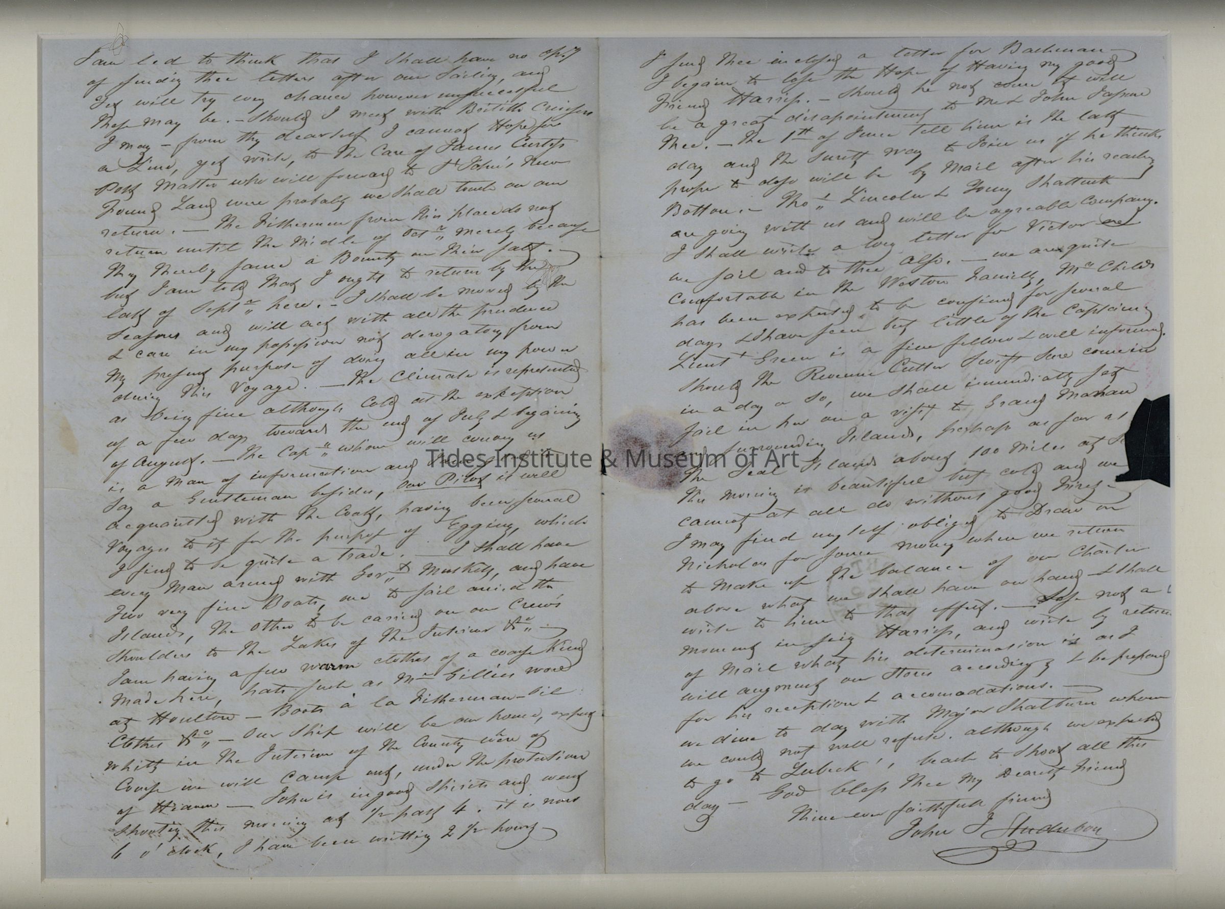 long letter for Victor and ___ and to thee also. - We are quite comfortable in the Weston family ___ has been expected to be confined for several days I have seen but little of the captain, Lieutenant Green is a fine fellow and well informed should the reverend Culter Swift ___ in a day or so we shall immediately set sail in ___ ___ ___ to Grand Manan and surrounding islands perhaps as far as the last islands above 100 miles of ___ the morning is beautiful but cold and we cannot do at all without good ___ I may find myself obliged to draw on Nicholson for some money when we return to make up the balance of our charter above what we have on hand I shall write to him to that effect. ___ and something by return of mail what his determination is and will augment our stores accordingly to be prepared for his reception and accommodations. We dine today with mayor Shatburn whom we could not well refuse although we are anxious to go to Lubeck back to shoot all this day. - God bless thee my dearest friend