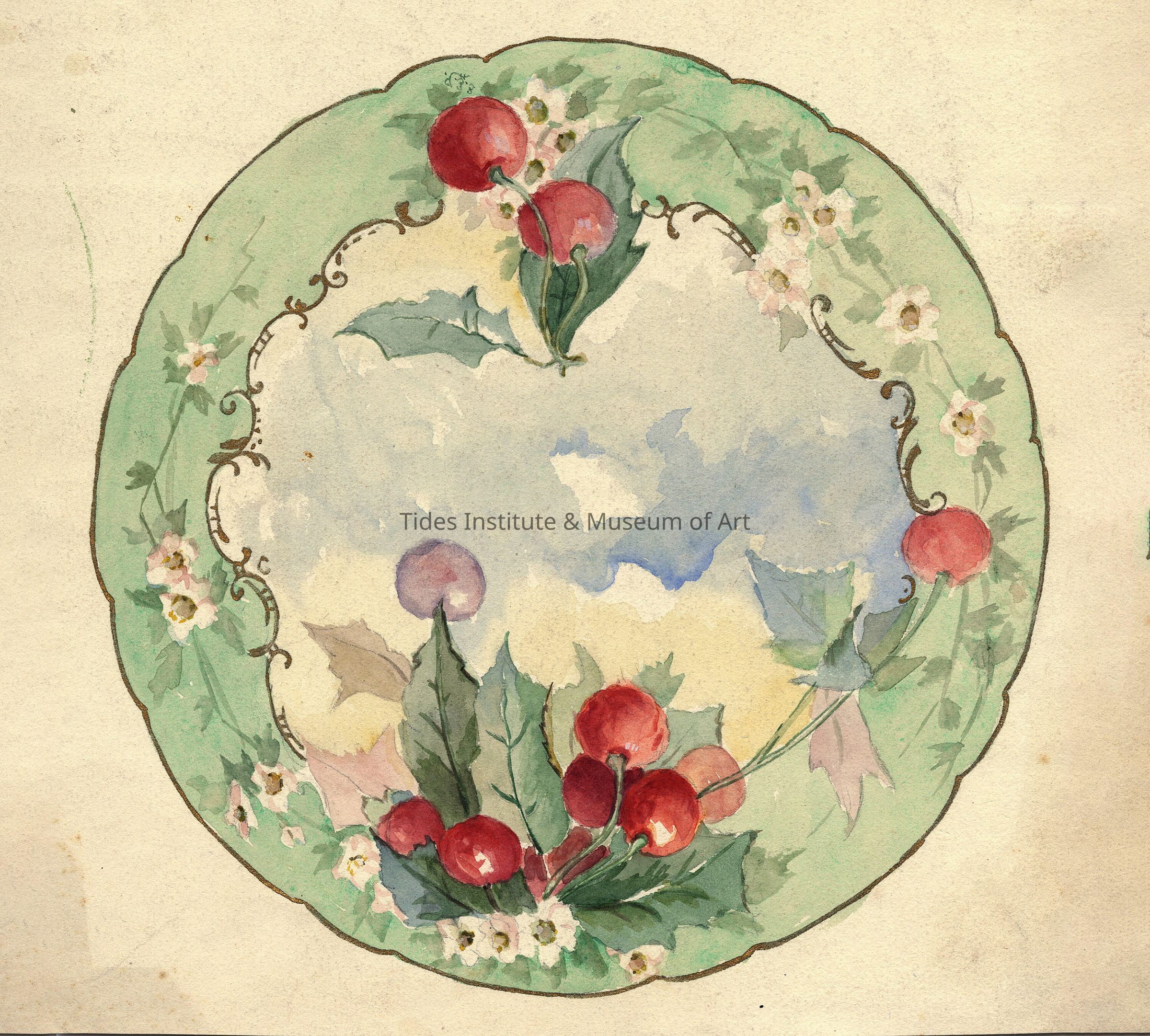 From a loose leaf bound book of watercolors and drawings for hand painted china, c.1900. Book came from the house Martha "Mattie" Waide who lived in at 17 Boynton Street, Eastport, Mainie. Mattie Waide was a prolific painter of porcelain china. Some of the watercolors are signed "Sidney Callowhill" of Boston. It is possible that Mattie Waide studied with Callowhill.