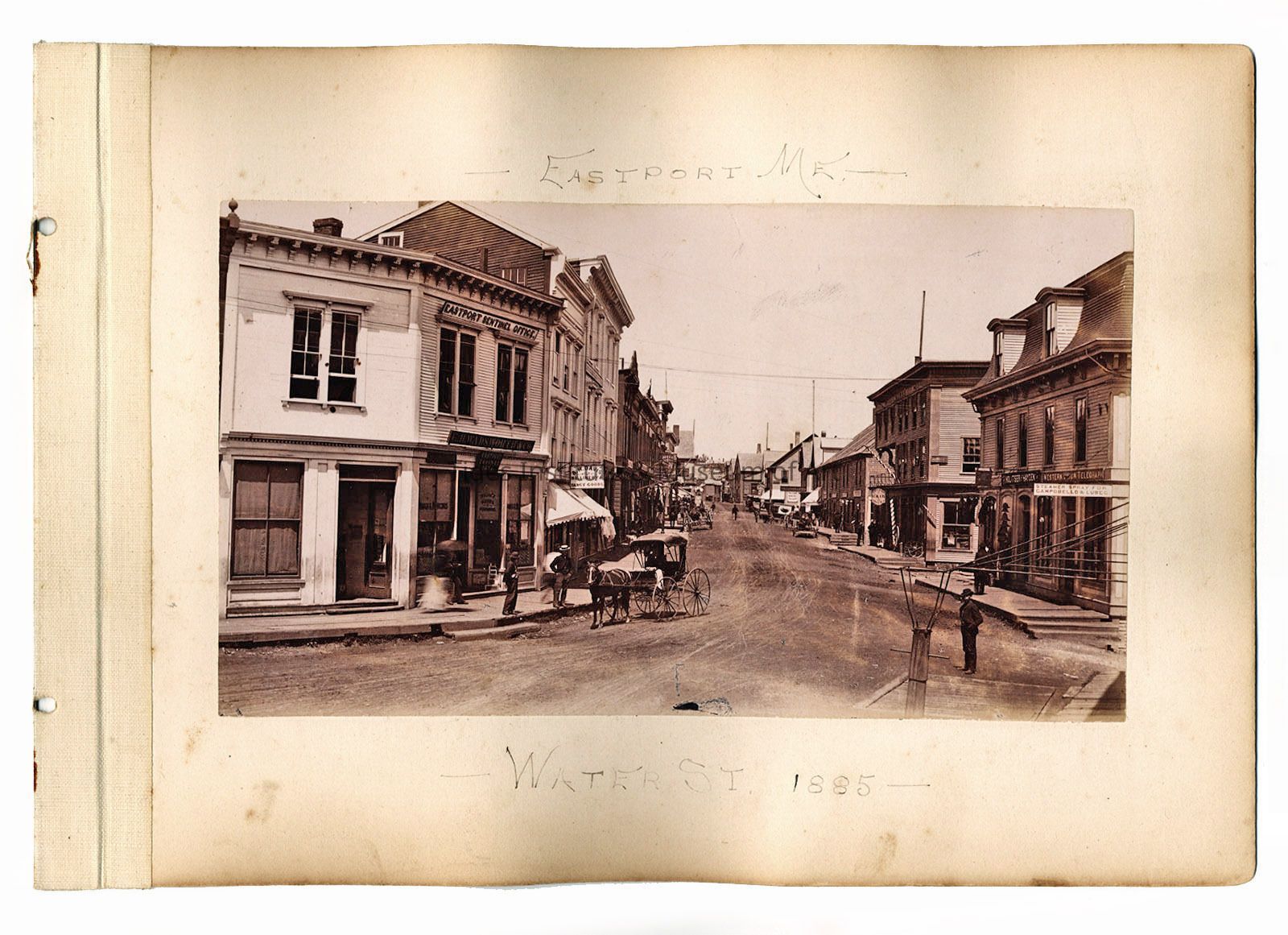Looking north on Water Street in downtown Eastport, Maine in 1885 before the Great Fire of October 14, 1886 that destroyed everything in view.
