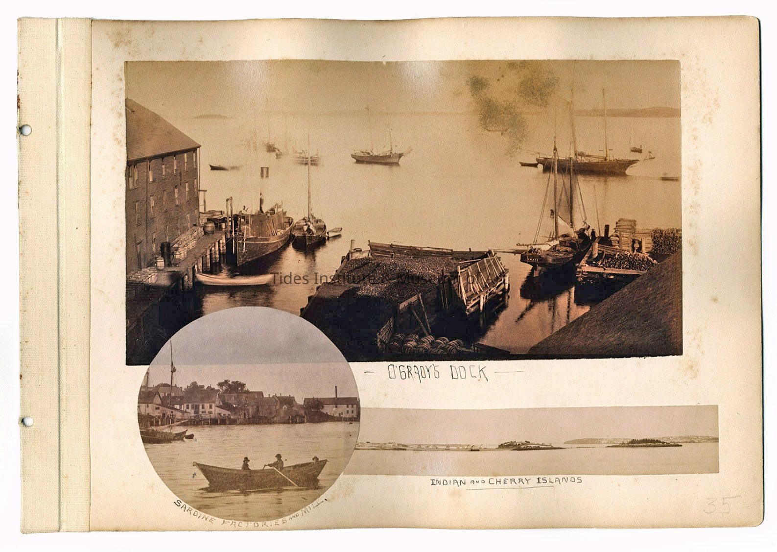 Top: O'Grady's Dock, Eastport, Maine. Bottom Right: Indian and Cherry Islands, New Brunswick Bottom Circle: Sardine Factories and Mill, Eastport, Maine