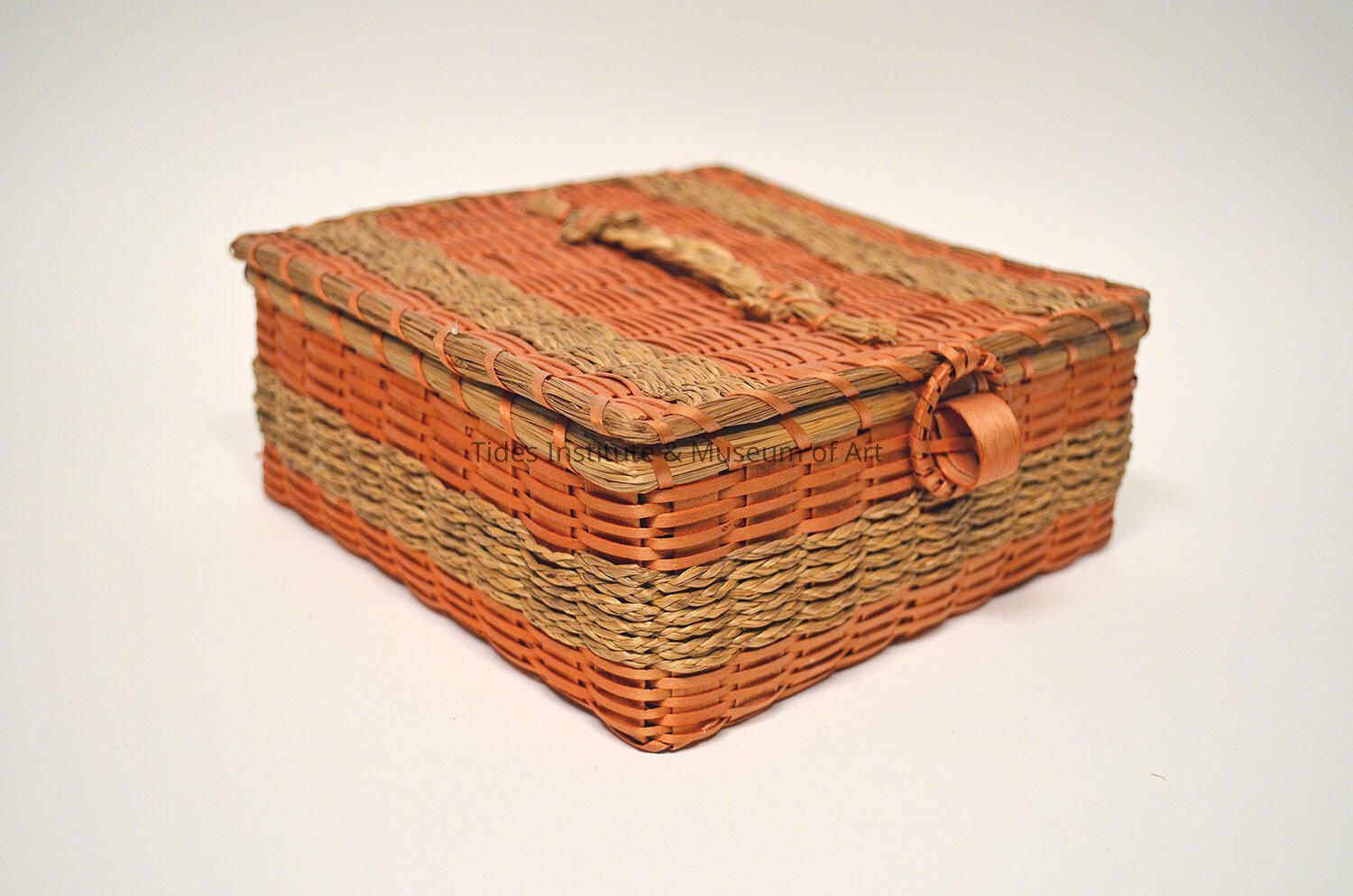 ?Passamaquoddy. Low square basket with braided handle on top. Second Shelf from Top.