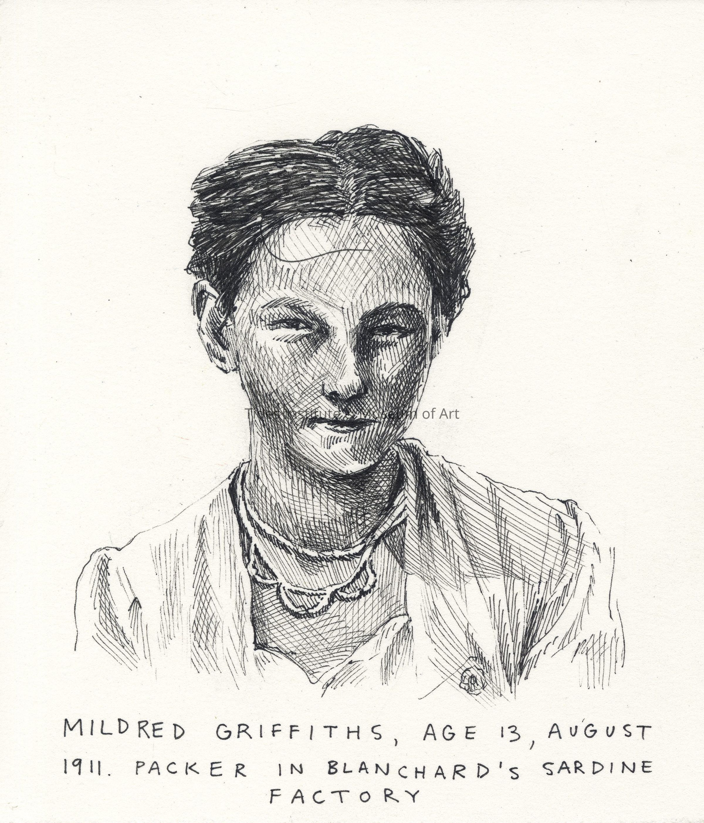 Maeve McCool | Mildred Griffiths, Age 13, August, 1911, Packer in Blanchard's Sardine Factory | Drawing, 2023Description
