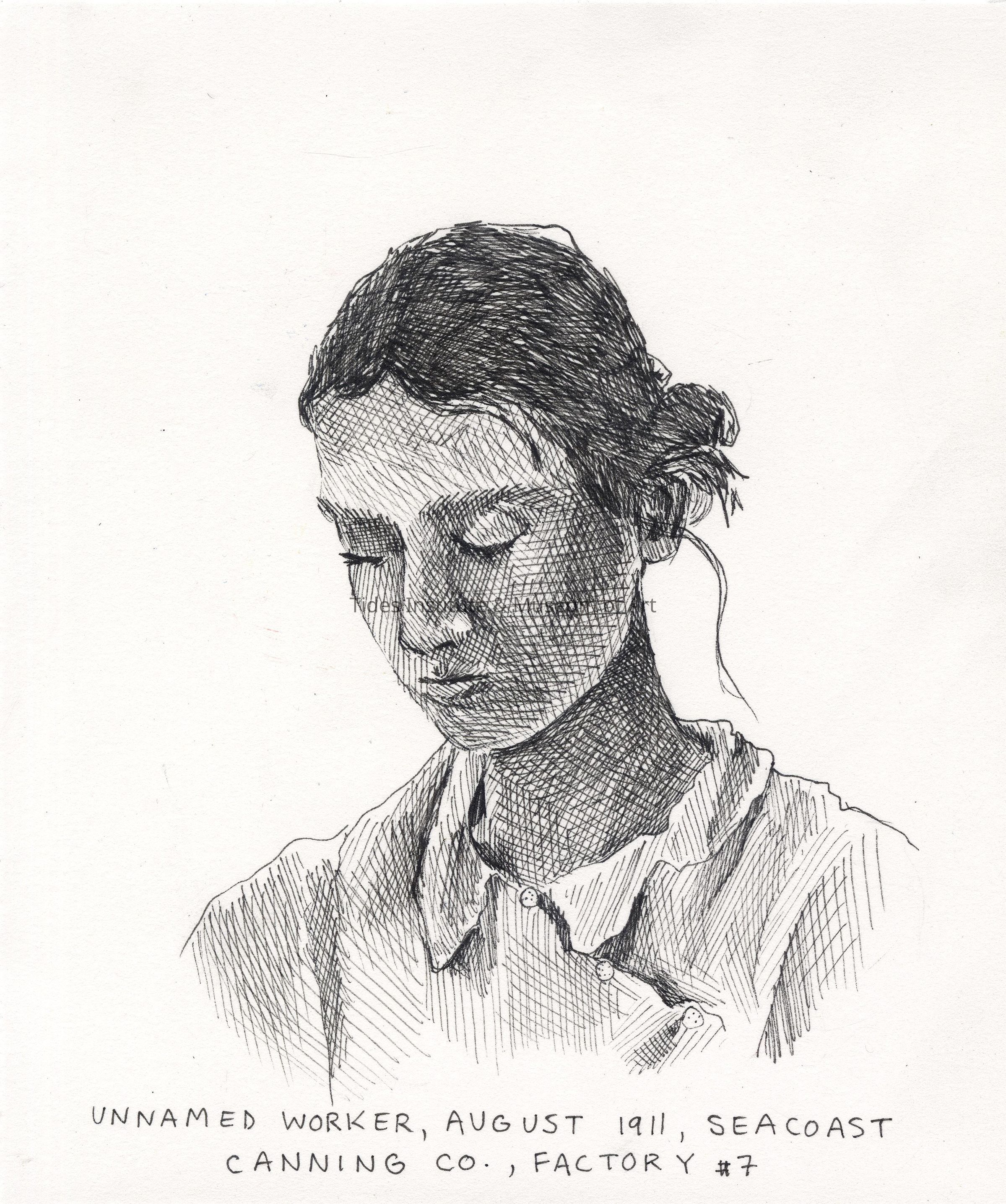 Maeve McCool | Unnamed Worker, August, 1911, Seacoast Canning Co., Factory #7 | Drawing, 2023Description