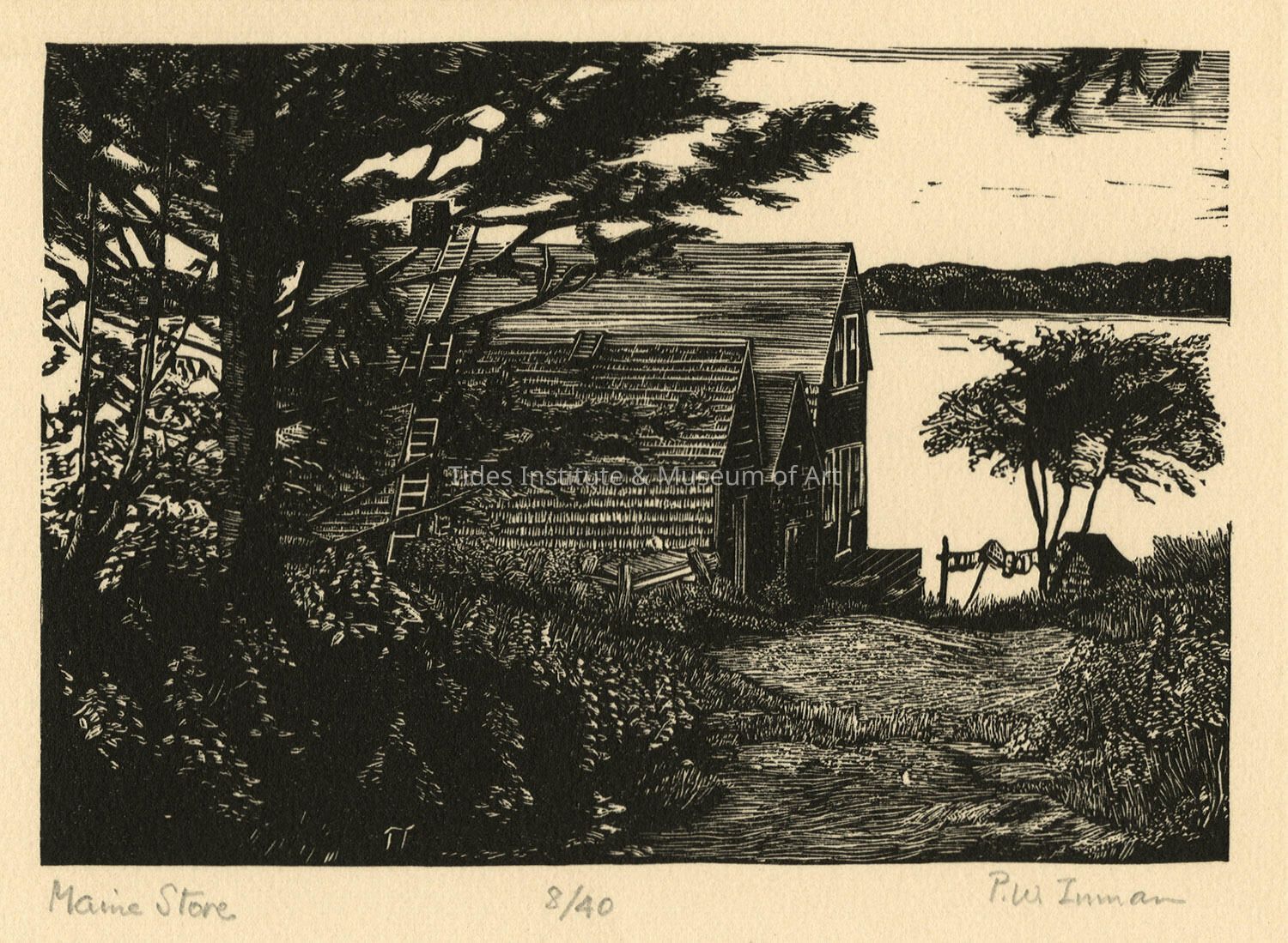The tucked-away store, hidden among the trees, provides residents with essentials for work and life. With no identifiable retail presence, one can assume that this store is frequented by locals only. Depicted from a slightly elevated perspective, Inman chose a composition that did not mimic a perfect postcard image of Maine but, instead, captured the reality of unpretentious life in a coastal community. Inman created this woodblock in 1945, and she and her husband used this print as their annual Christmas card that year.