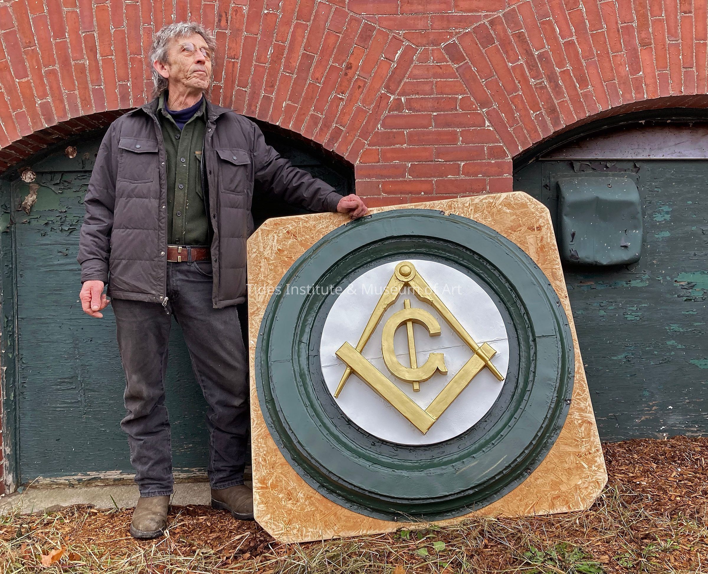 In this photograph, the board that the emblem is mounted on is 43 3/8" wide by 43 3/8" high. Photograph of Bill Schaefer, standing next to emblem, who restored the emblem in 2023.