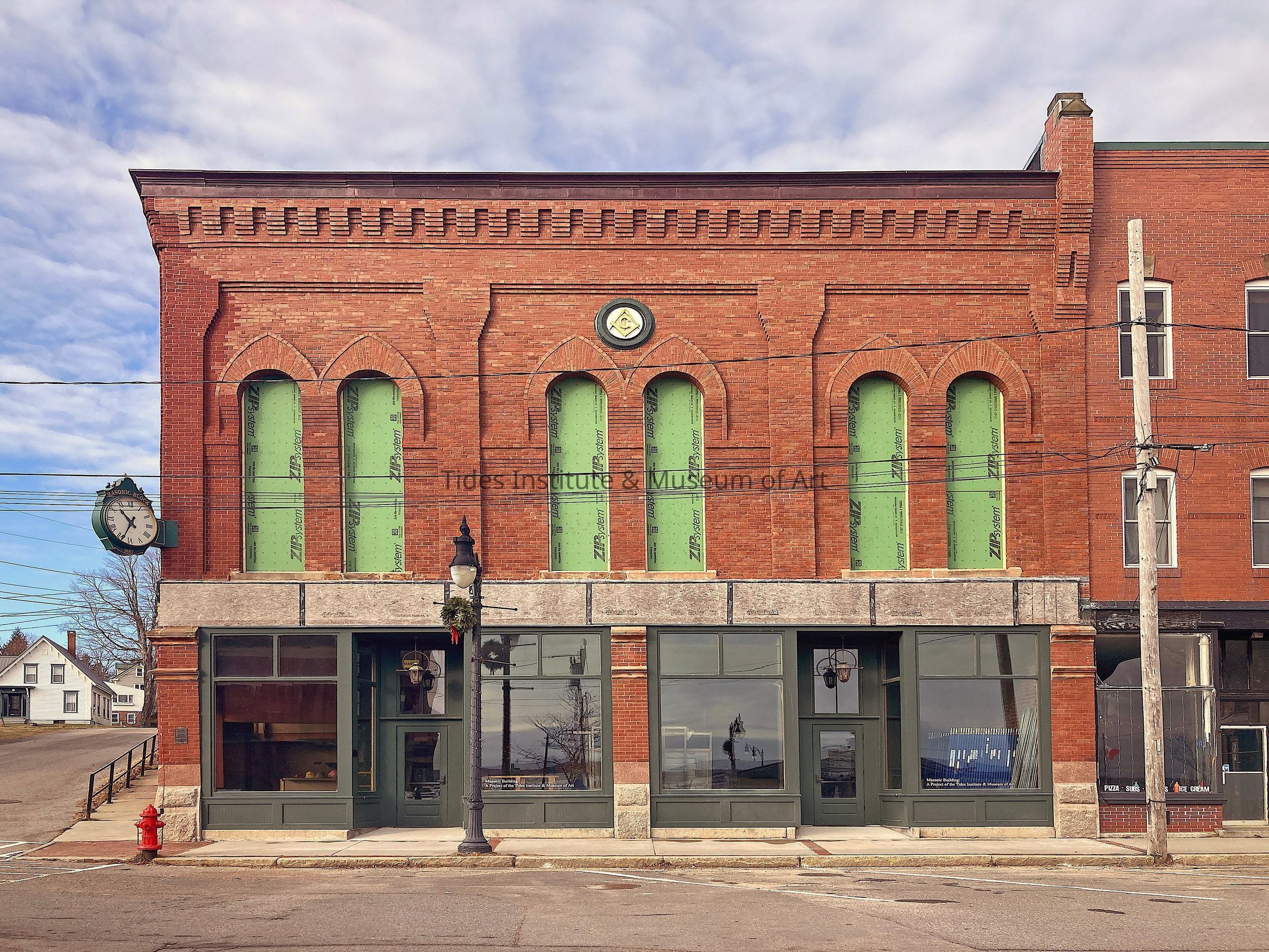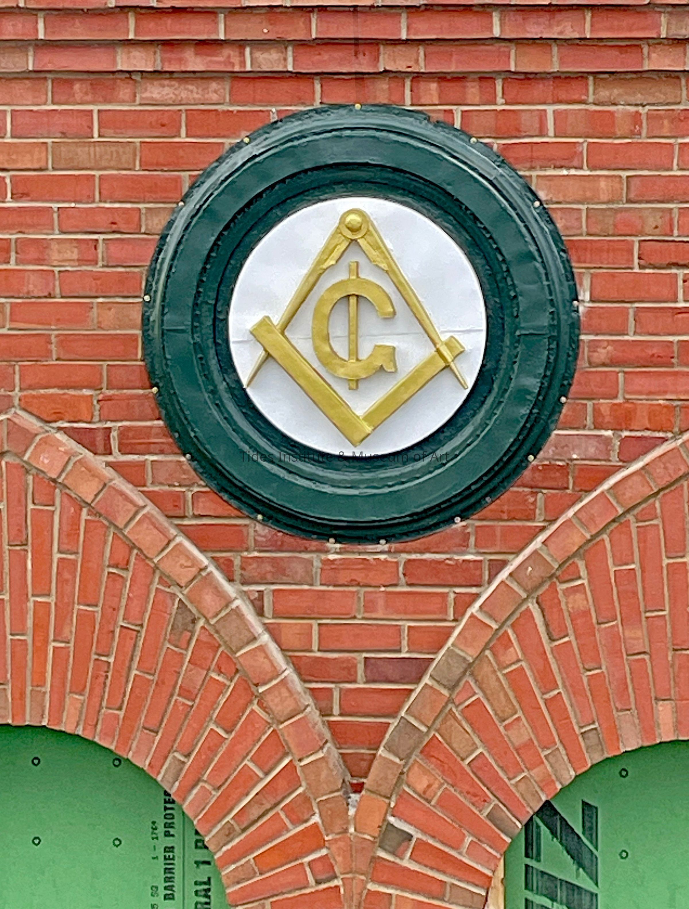 HISTORIC 1887 MASONIC EMBLEM RESTORED! The large original Masonic emblem that was attached to the upper front of our Masonic building has been restored. The building was built in 1887 and the emblem attached at the same time. The emblem was taken down when the badly deteriorated upper front wall of the Masonic building was taken down last year. The 42" in diameter tin emblem was in very tough shape, but Bill Schaefer, artist and restorer of many things extraordinaire, was able to repair and restore it through extensive cleaning, soldering and then repainting, That's him standing next to the restored emblem in the photo. The restored emblem will go back on the Masonic building this coming spring once the upper wall is completely rebuilt and restored.
