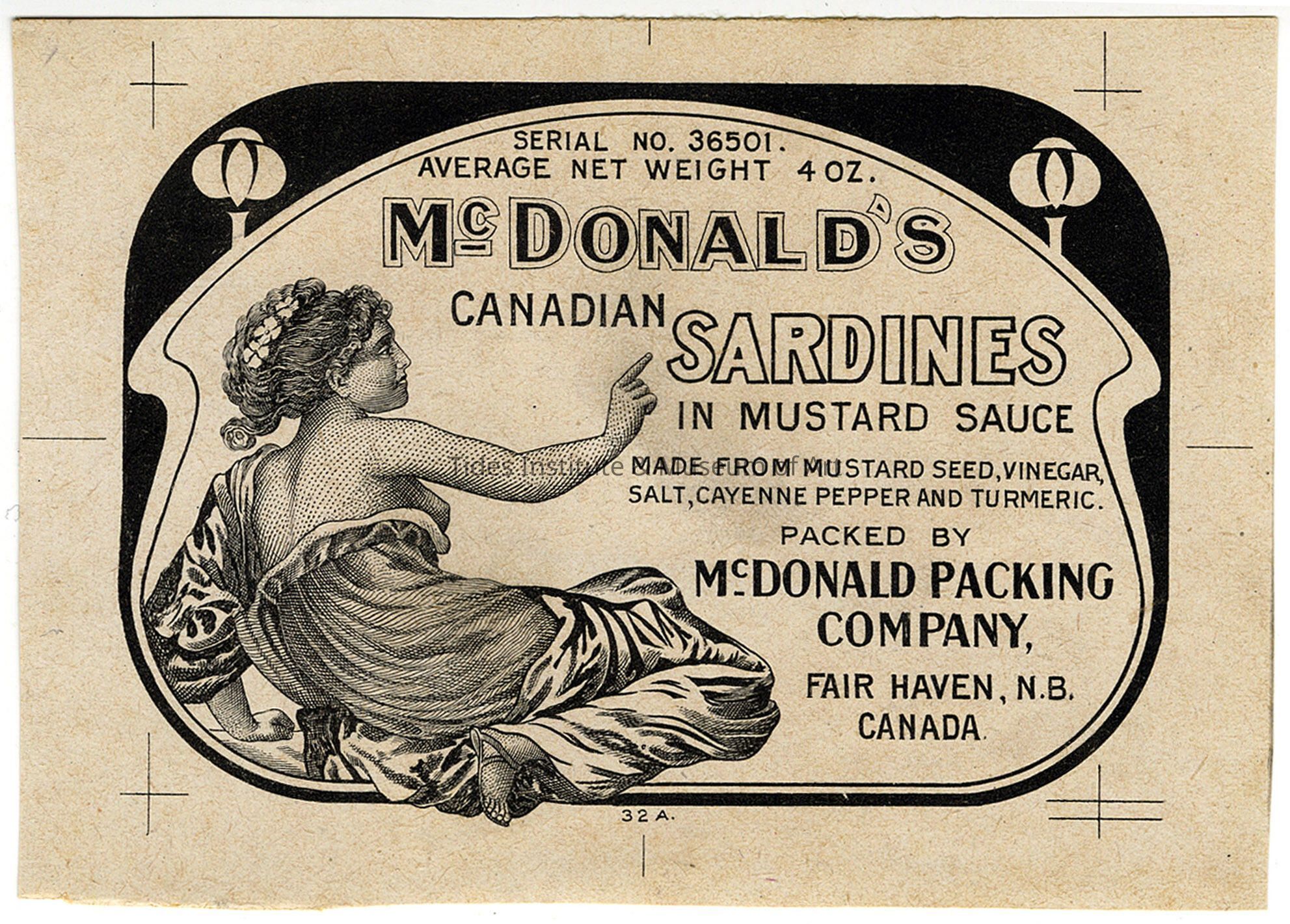 Old Accession Number: 826 Description: Packed by McDonald Packing Company. Fair Haven, N.B. Canada.
