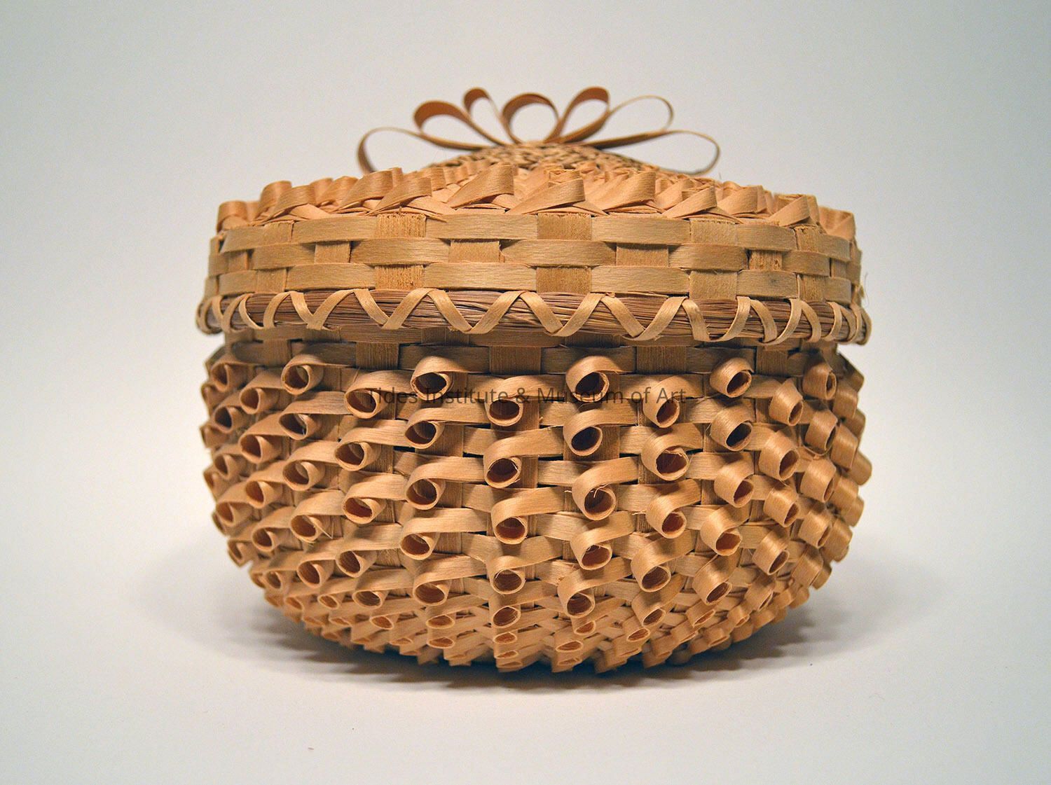 D. Campbell. Passamaquoddy. Medium sized basket with ribbon bow on top of lid. 2001. Middle Shelf.