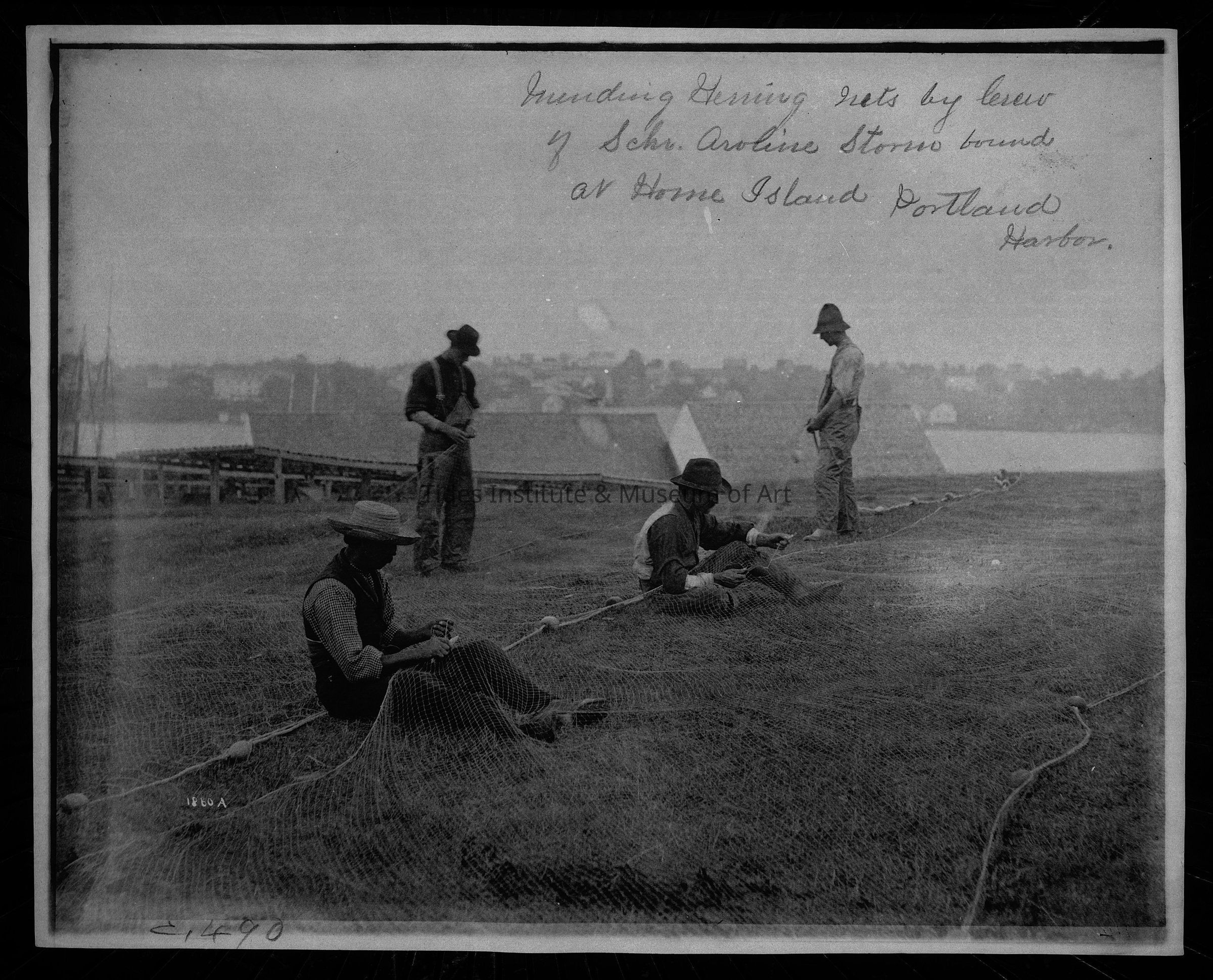 Mending Herring Nets by Crew of Schoooner Aroline Storm bound at House Island, Portland Harbor