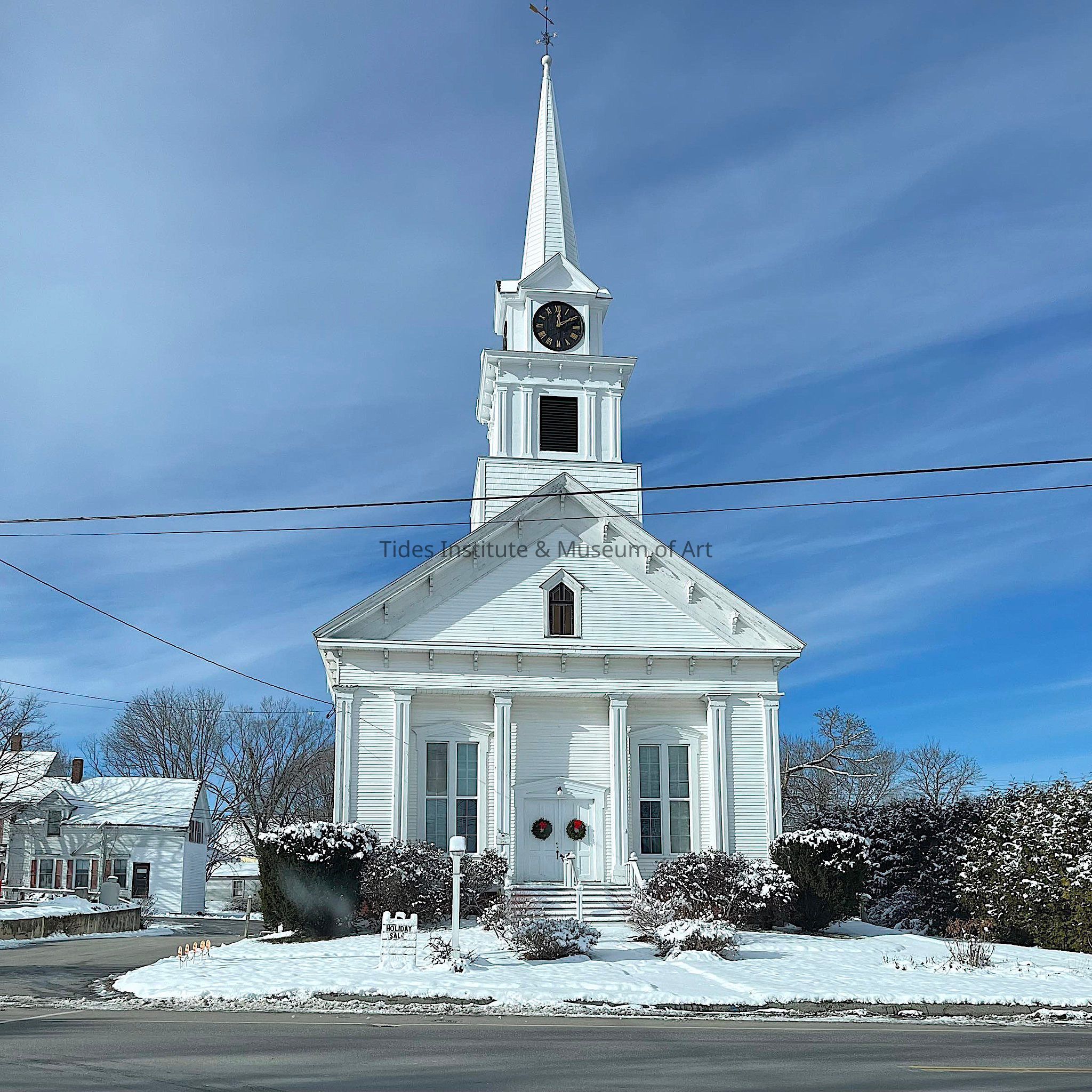 The Union Church on Bridge Street was organized in 1853; a building built in 1854 by J.T. Wallace, master builder. It had Grecian Doric columns and a spire 106 feet tall. The doorway and rectangular windows are capped with pedimented lintels. This clapboard structure has a bracketed cornice, square steeple base, and a pedimented gable above each clock face. It was financed by the selling of 60 shares of $50 each to members. A vestry was built behind it in 1893 so the ladies would have a place to meet and sew. The church's earliest tradition was that it served all denominations, but in 1907 it became affiliated with the Congregational Conference. The small group struggled along until 1928 when it was federated with the Milbridge Methodist Church, with services alternating back and forth between the two buildings. This federation was not dissolved until 1973 when the church became affiliated with the Congregational Conference. TH