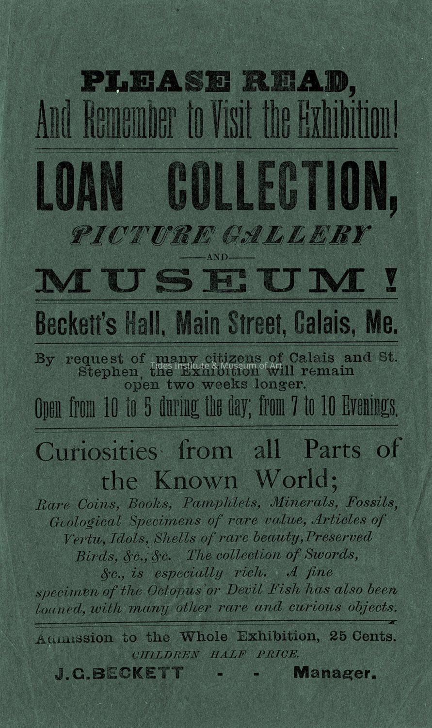 A hand bill for perhaps the earliest “museum” in this region located in Beckett’s Hall on Main Street in downtown Calais, Maine. It likely dates to the 1860s. This early short lived museum and exhibition space, a version of a cabinet of curiosities, featured all sorts of exotic artifacts and displays that were popular at the time: rare coins, books and pamphlets; rare minerals, fossils, geological specimens and shells; and preserved birds along with collections of swords and paintings. Admission to the museum and exhibition space was 25 cents with children charged half price. The museum was the brainchild of John Gregg Beckett, better known as J.G. Beckett, a businessman and entrepreneur, who was born in Scotland in 1828, the son of a confectioner. In the mid-1840s, J.G. Beckett moved to Boston and then a few years later in 1850 to Eastport, Maine where he started a bakery. A year later, he relocated again, this time to nearby Calais, Maine where he resumed a bakery and added a confectionary in downtown Calais. There he remained for several years until late 1858, when he abruptly shut down his business and returned to Scotland to recruit emigrants to Canada. Three years later, in 1861, he was back in Calais and resumed his bakery and confectionary business. It was during this time following his return that J.G Beckett opened his short lived museum and exhibition space. In 1870, a great fire in Calais burned down the wooden building he had named “Beckett’s Hall” in his museum and exhibition hand bill. He died in 1889.