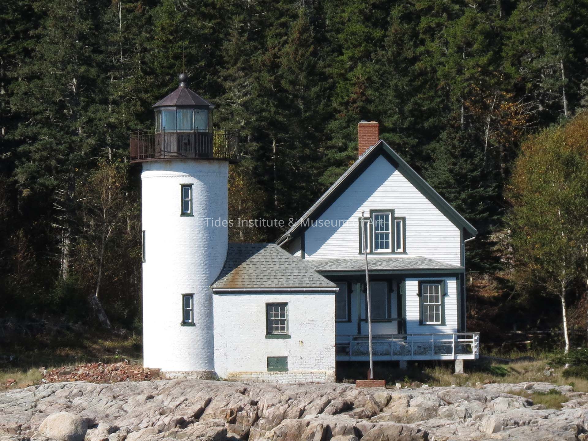 surmounted by a centrally placed light tower. This resembled those structures constructed earlier at Grindle Point and Indian Island. In 1875 the new house was built but the tower remained in place on the original dwelling (which was probably brick). Nine years later a portion of this house was remove and the tower was left exposed at one end. Finally, in 1894, the diameter of the tower was increased to its present size. The station was deactivated in 1934 and sold to a private citizen.