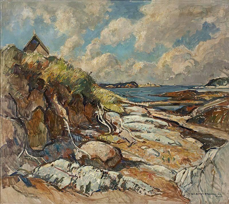 A large oil on board painting (32” high x 35.75” wide) of North Head, Grand Manan, New Brunswick by American painter, William Lester Stevens. It dates to about 1960. The Tides Institute raised the necessary funds to acquire the painting in 2014 from the Altermann Galleries of Santa Fe, New Mexico. Stevens was born in Rockport, Massachusetts in 1888 and first studied painting with the marine painter, Parker Perkins, of Rockport. Later he studied at the School of the Museum of Fine Arts in Boston. During the First World War, Stevens joined the U.S. Army and was sent to Europe where after the war he was able to study master works of art in the museums of Europe. Returning to the U.S., Stevens had a one man show of his works at the Boston Art Club and had one of his paintings selected for the Corcoran Gallery’s annual exhibition of contemporary American art. Stevens then returned to Rockport and in 1921 helped found, along with many other artists, the Rockport Art Association. During the summers he taught at Rockport and also at Boston University and Princeton. In 1934, he left Rockport and moved to Springfield, and then to Conway, Massachusetts where he lived and painted for the rest of his life. During the summer months he made trips to Vinalhaven and then to Lubec in Maine as well as Campobello Island and Grand Manan Island in New Brunswick. Stevens ran an art school for awhile on Grand Manan. He died in 1969.