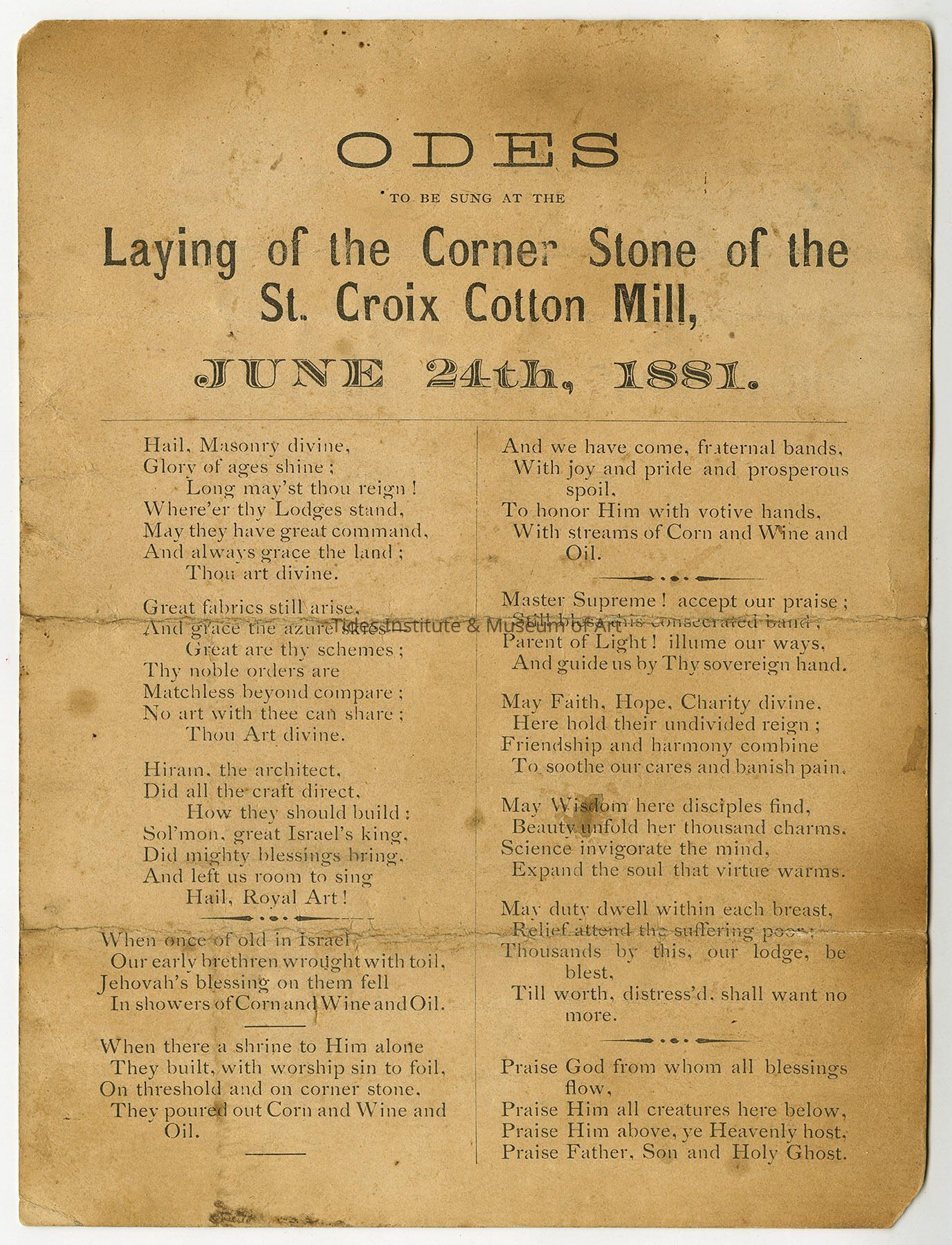 Odes to be Sung at the Laying of the Corner Stone of the St. Croix Cotton Mill | St. Stephen, New Brunswick