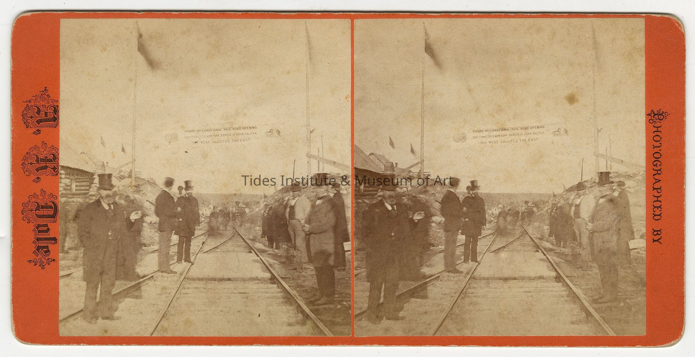 OPENING OF THE EUROPEAN & NORTH AMERICAN RAILWAY, VANCEBORO, MAINE, 1871! Rare stereoview photo that just came into our collections that shows the significant ceremony held on October 19, 1871 at the northern Washington County border community of Vanceboro, Maine for the opening of the European and North American Railway. U.S. President Ulysses S. Grant, along with other U.S. and Canadian dignitaries, attended the event which marked the completion of the railway line connecting Bangor, Maine, to Saint John, New Brunswick. The ceremony included a luncheon, speeches, and a symbolic "last spike" moment at the border crossing between Maine and New Brunswick. Banner in the photo reads: Grand International Rail Road Opening, San Francisco, New York, Bangor, St. John, Halifax, The West Salutes the East. Photo was taken by A.K. Dole and published by C.L. Marston of Bangor, Maine.