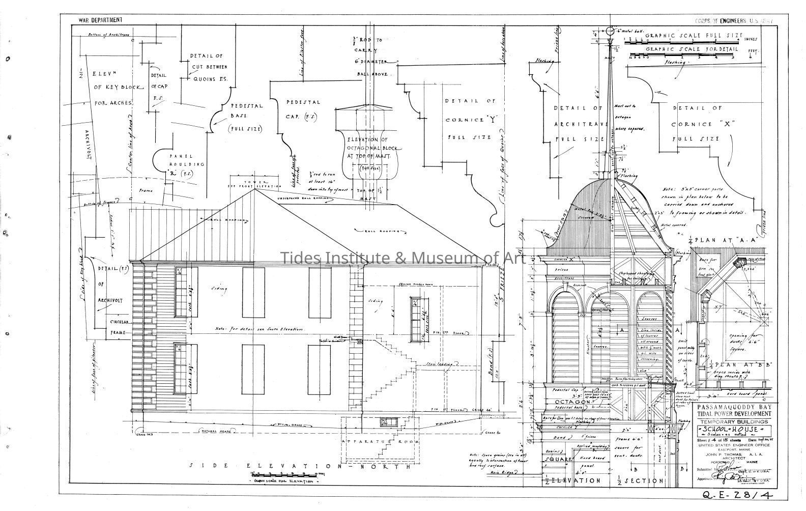 Passamaquoddy Bay Tidal Power Development | Temporary Buildings | School-House | Side Elevation - North & Details | Q-E 28/4