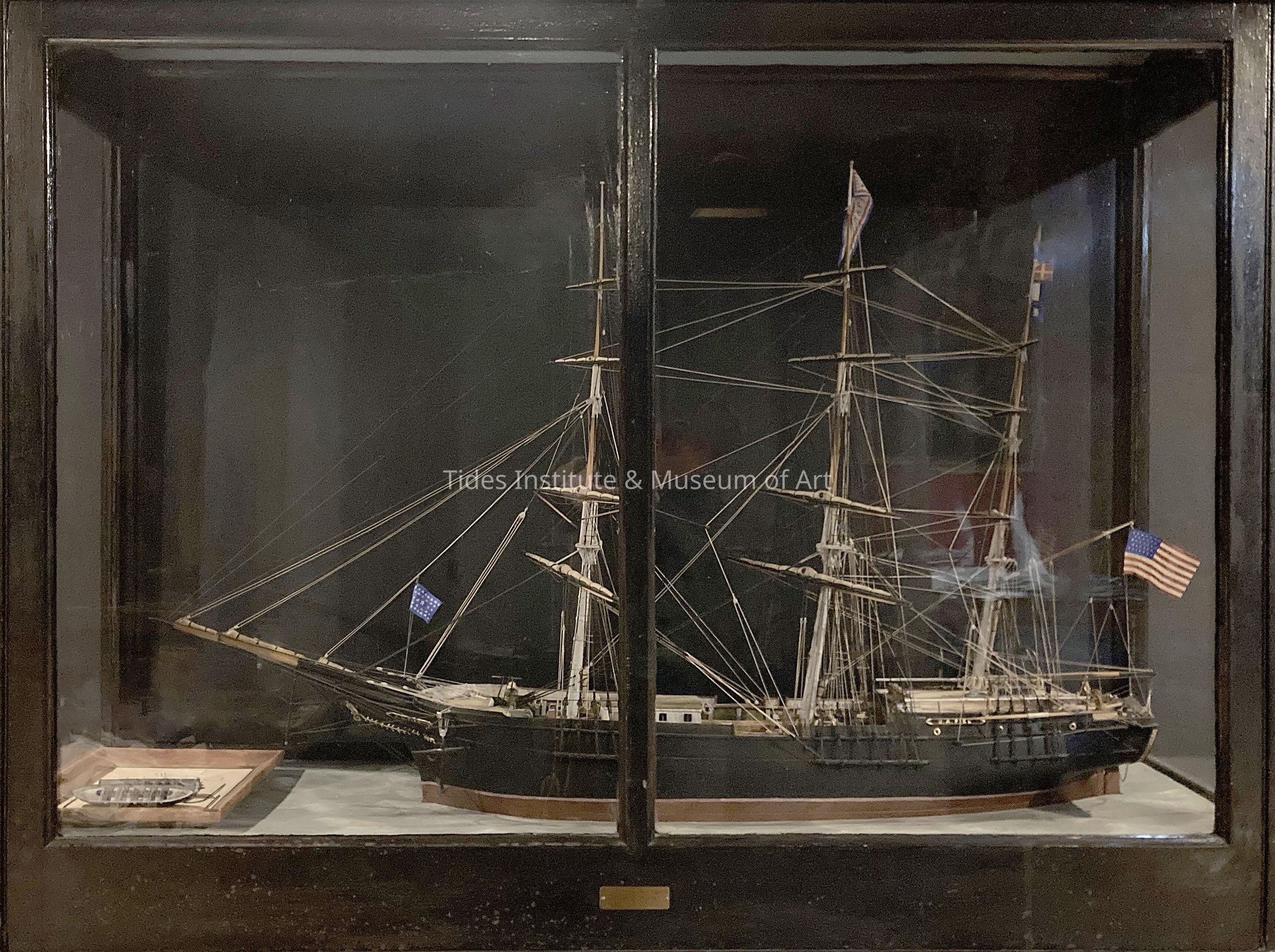 The model was completely restored and re-rigged in 1963 by Clark Huhn of Eastport. The yawl and longboat at the stern davits, on loan from his collection of ship models, are the size and type used by merchantmen in the mid-1850s; they replace the ship's boats in the nearby frame, which are too crude to have been the handiwork of the larger model's builders.