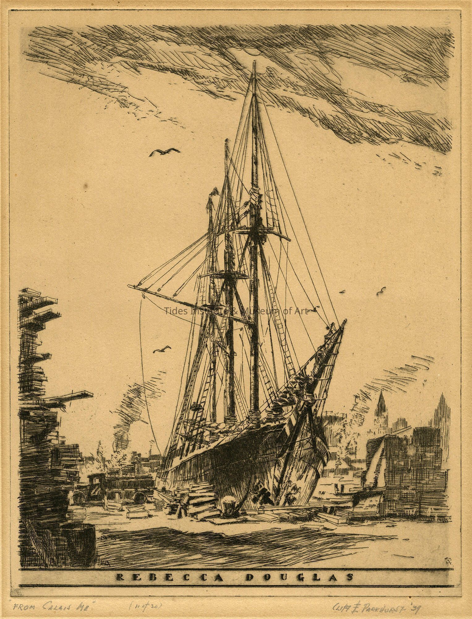 Artist: Clifford E. Parkhurst Classification: Prints Circa: 1939 Old Accession Number: 955 Description: Ship from Calais, Maine. Edition 11 of 20.