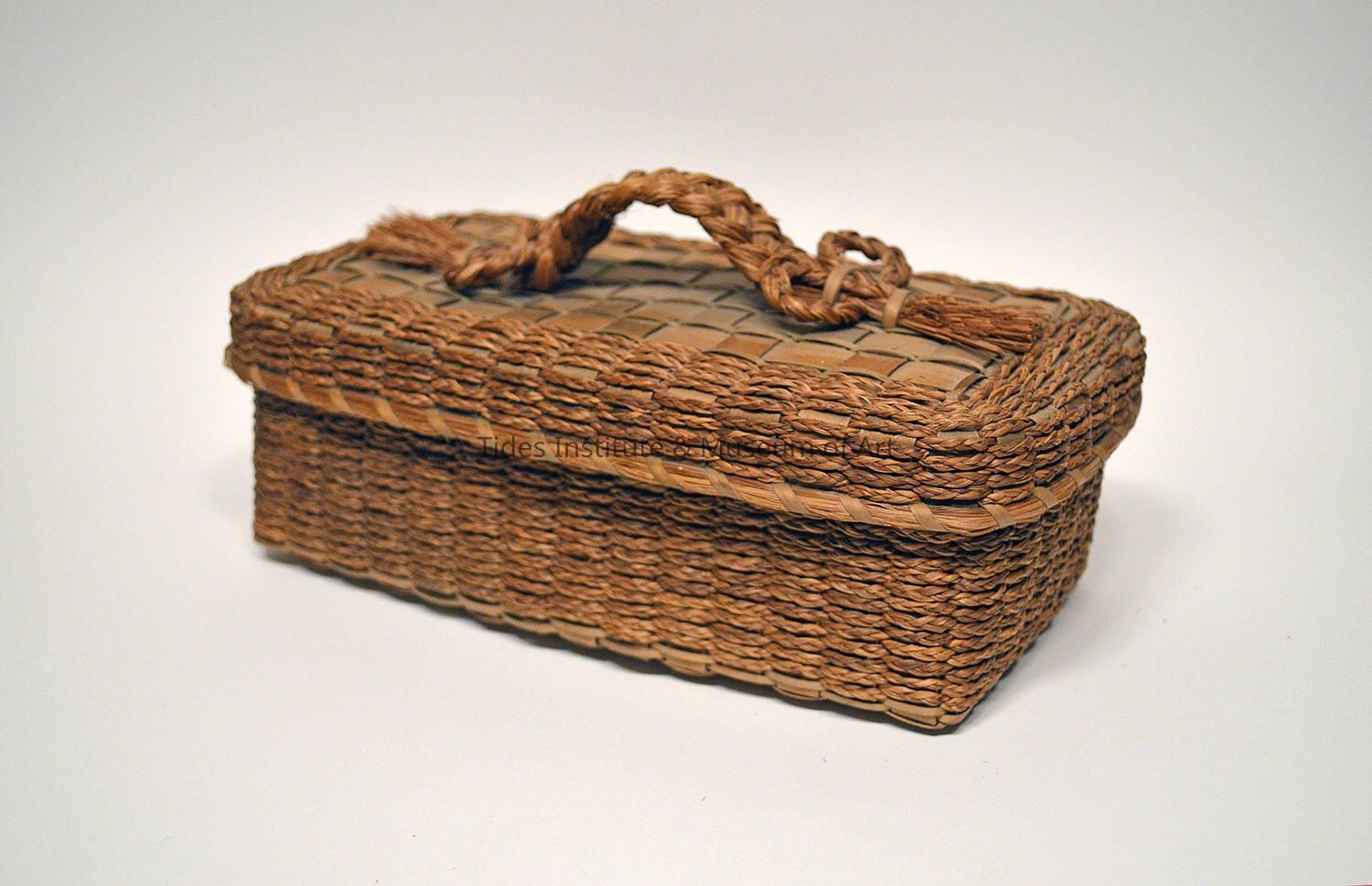 Retangular box shaped basket with braided handle on top [Passamaquoddy] | Unknown ArtistDescription