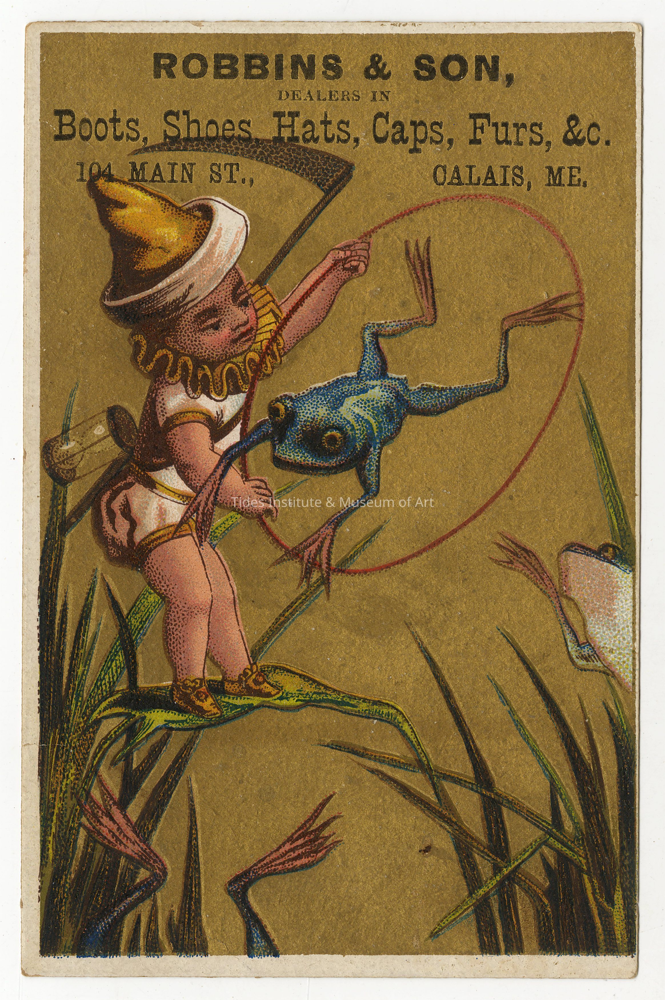 Robbins & Son, Dealers in Boots, Shoes, Hats, Caps, Furs, &c. | 104 Main Street, Calais, Me. | Trade Card