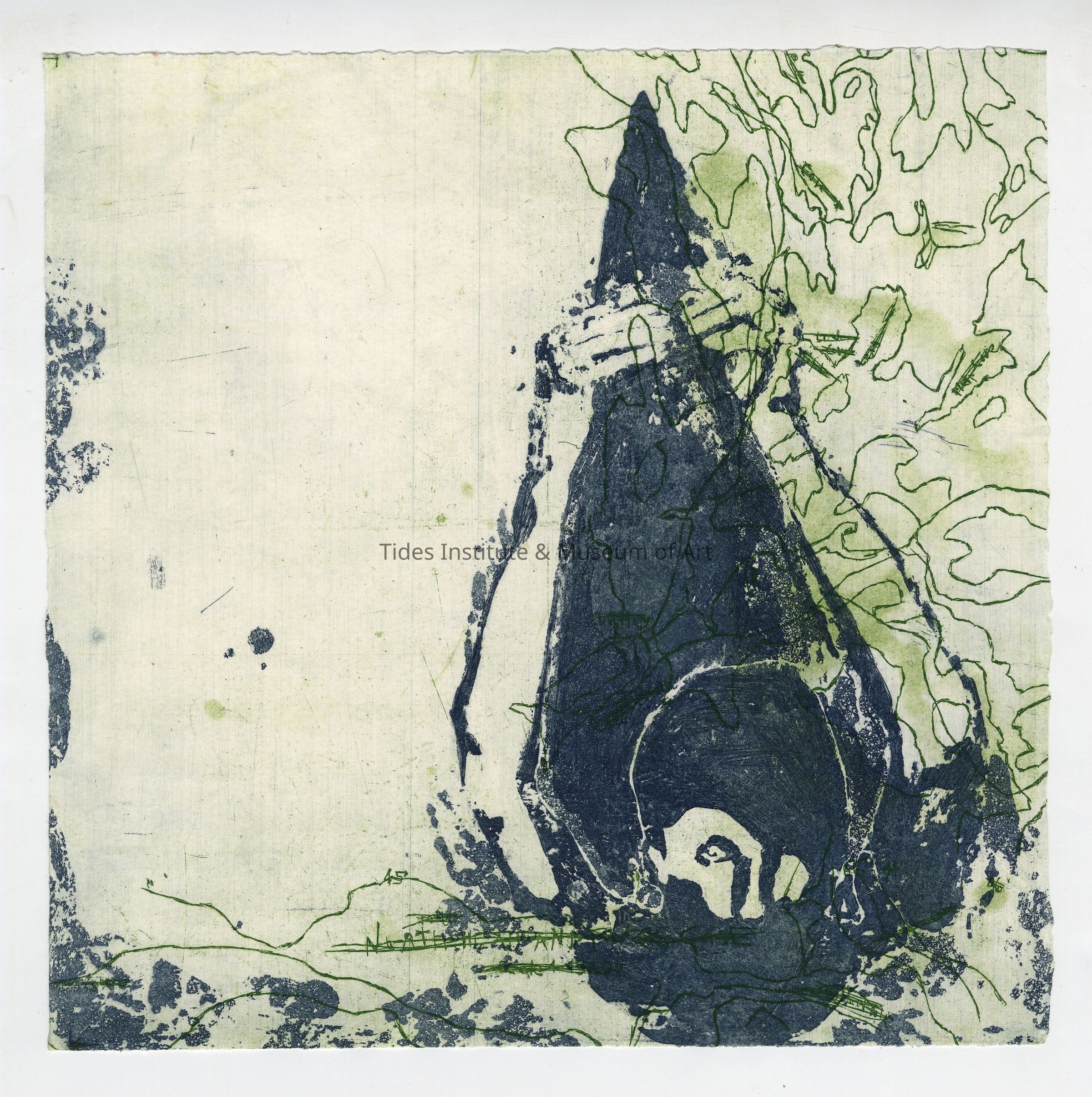 Robin Kelly (intaglio) – The original map has been reinterpreted into a drawing with the names of places forgotten or crossed out. The figure makes a gesture that further obscures the reading of the landscape to imply that all histories and their documents are inherently subjective and faulted by human influence.