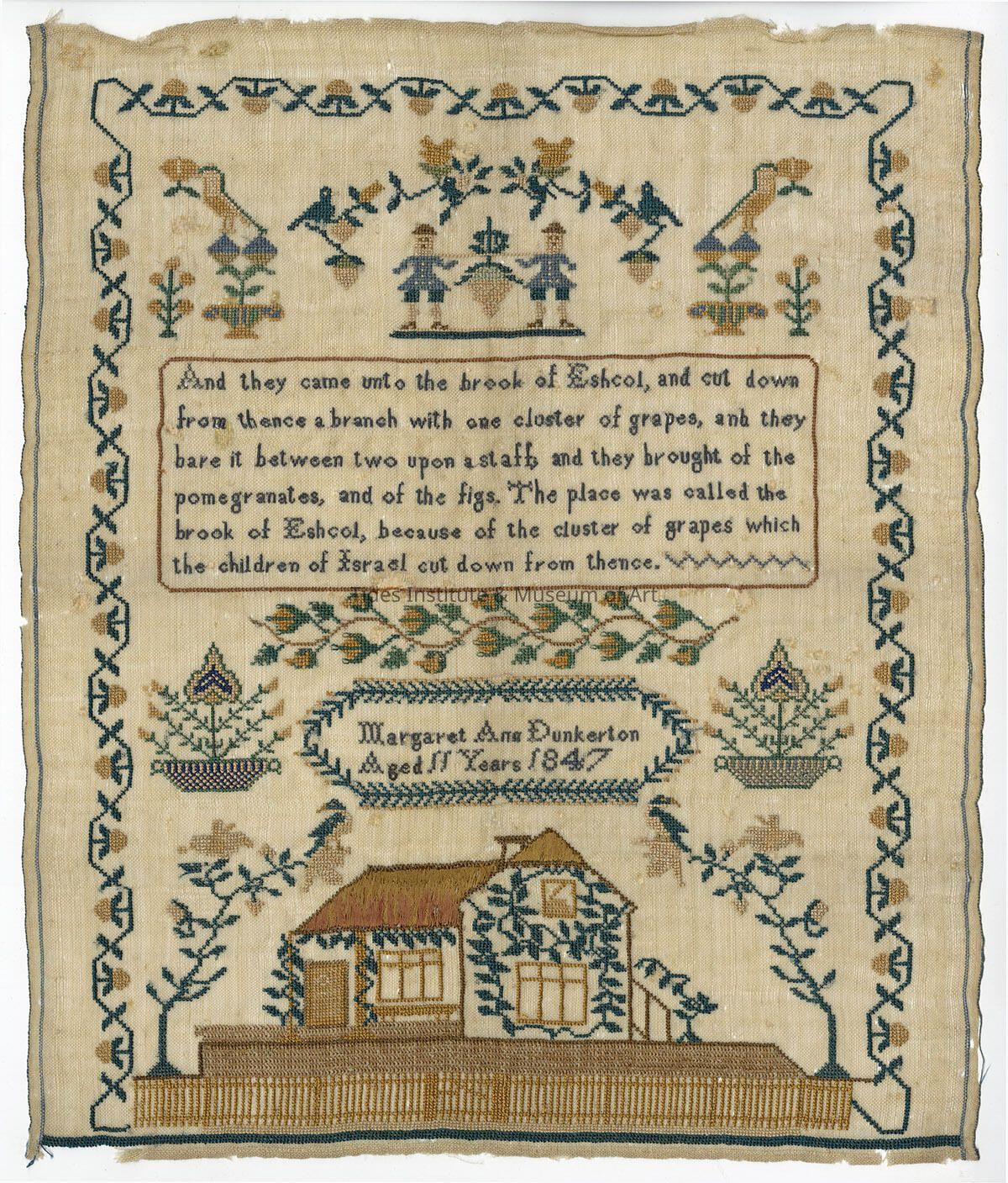 A mid-19th century hand stitched sampler that according to stitched writing on the sampler dates to 1847 and was made by 11 year old Margaret Ann Duckerton of Eastport, Maine. There appears to be some discrepancy as to Margaret Dunkerton's actual age at the time she made the sampler or the date of the sampler as records indicate she was was born in 1838 in Windsor, Nova Scotia. This would put her age at nine and not 11 when she made the sampler. Soon after Margaret’s birth, her family moved to Eastport. The making of samplers was a common activity for girls during this time as a way to help teach basic needlework skills while including the alphabet, numbers, important quotations and family history. Margaret’s sampler has several of these elements in a well made and well balanced design. There is what might represent the family house and fence at the bottom of the sampler, a quotation from the King James version of the Bible (the Book of Numbers, Chapter 13, Verse 23), and above the quotation two men in period clothing with a hawk in a tree branch on either side. Three sides of the sampler are framed with a vine like scroll. Margaret went on to marry James Lawrence in 1855 and together they had six children. She lived the rest of her life in Eastport until 1935 dying at the age of 97 and is buried in Hillside Cemetery in Eastport. The sampler was handed down through later generations of the Dunkerton-Lawrence family and eventually turned up for auction in California in 2008. The Tides Institute acquired the sampler at this auction.