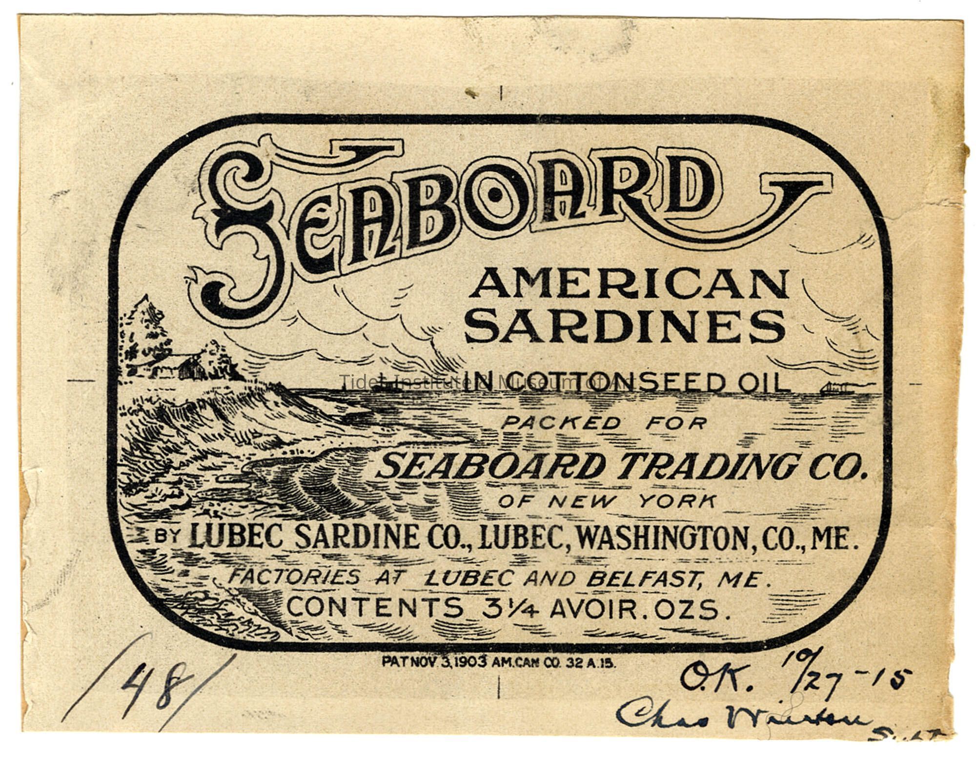 Packed for Seaboard Trading Co. of New York. By Lubec Sardine Co. Lubec, Washington County, ME. Factories at Lubec and Belfast, ME.