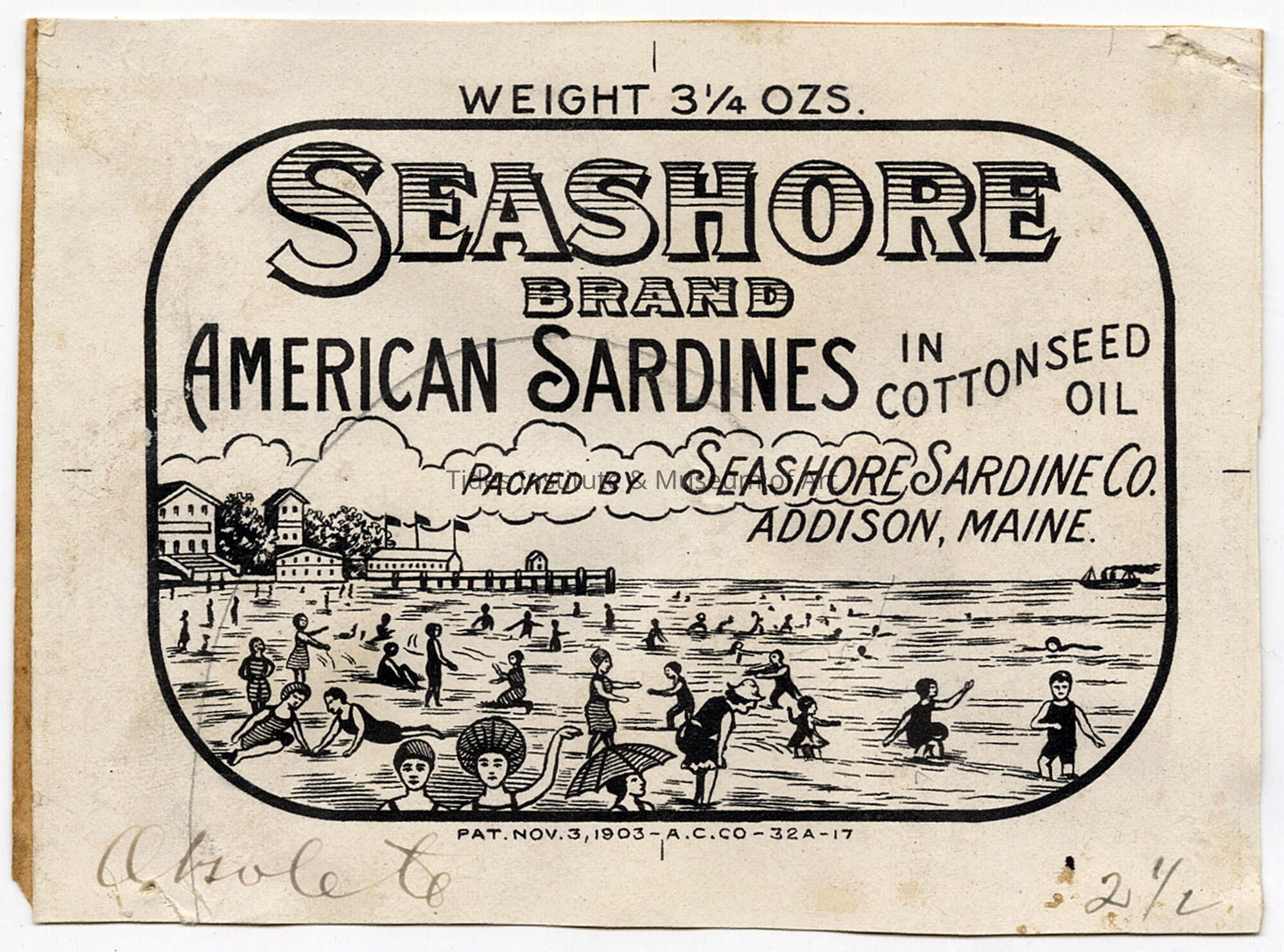 Old Accession Number: 863 Circa: 1903 Description: Packed by Seashore Sardine Co. Addison, Maine.