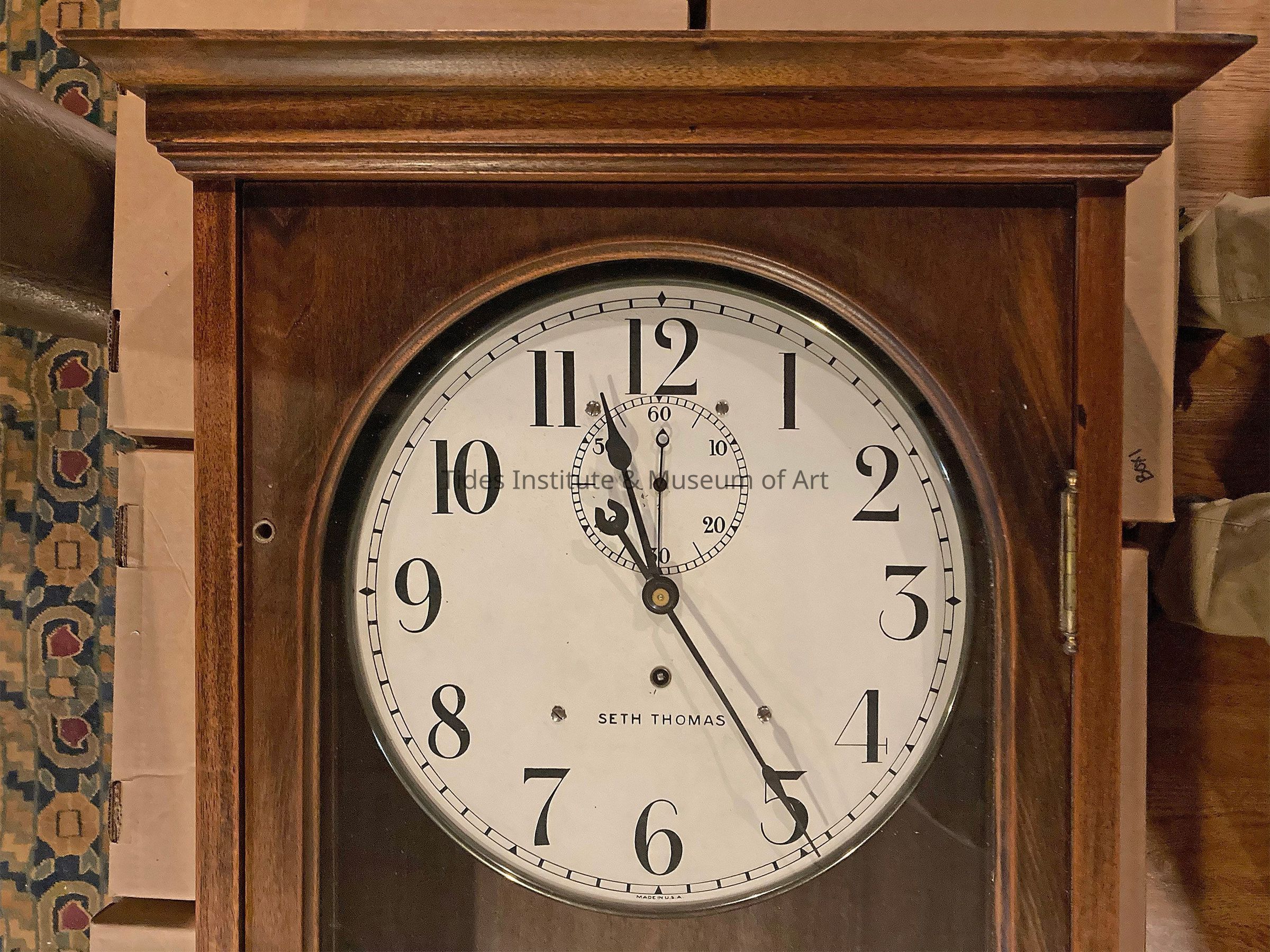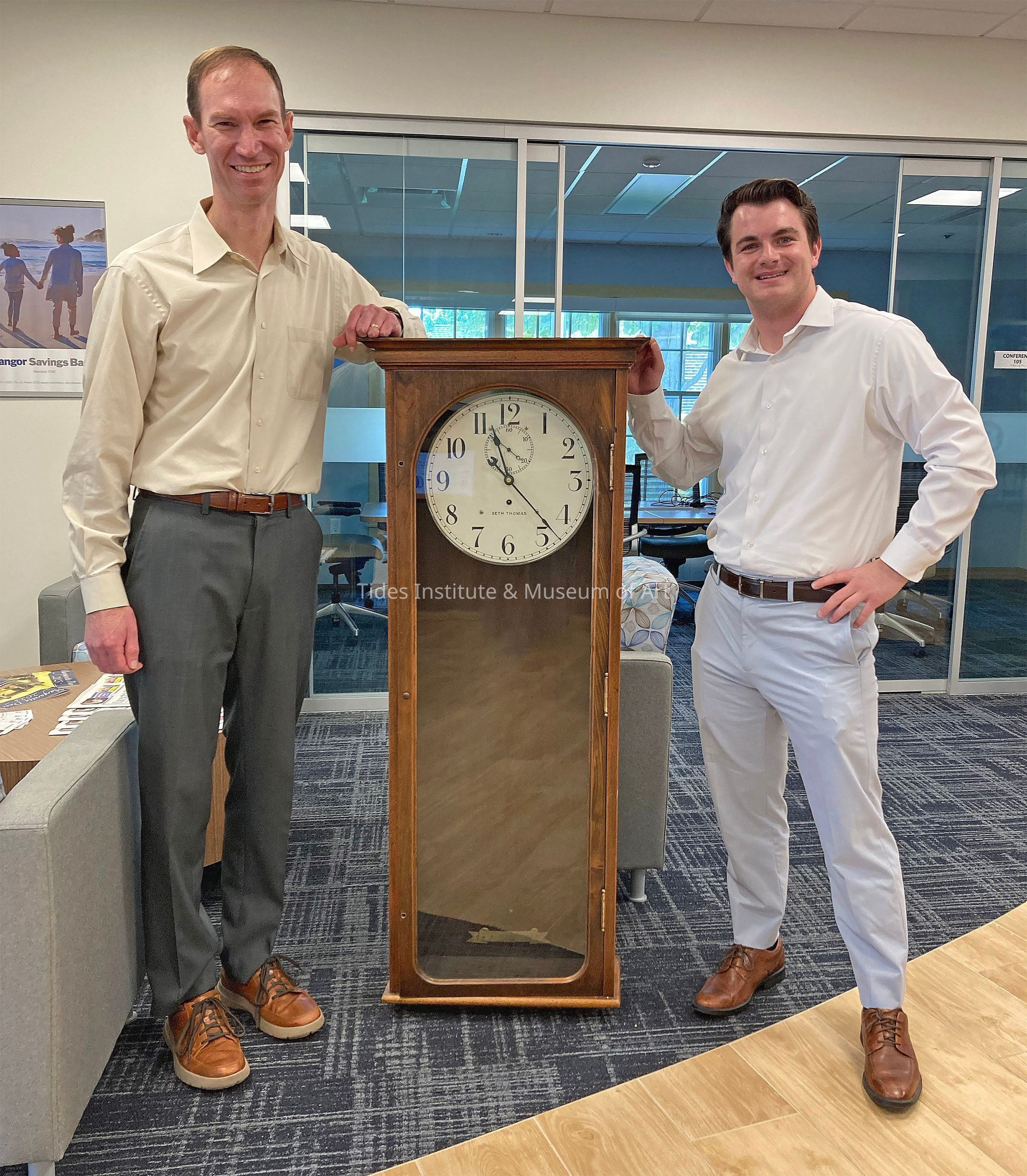 A CLOCK RETURNS! A tall (nearly 5 feet in length) wall clock that once graced the walls of our main building, the former Eastport Savings Bank building, in downtown Eastport, Maine has recently returned. We’re trying to find more about the history of the clock. We’re told the clock hung in the main lobby of the Eastport Savings Bank. Then after this bank was absorbed by the Bangor Savings Bank and a new branch building was built at the top of a hill on nearby Washington Street, the clock travelled there and hung in the conference room. A recent remodeling of this branch building did not allow for the clock to remain there. We made some inquiries and Bangor Savings Bank was willing to donate the clock to our collections and have the clock return to its original bank building home (now our main building). This is where it now is. We’re grateful to Bangor Savings Bank for their generosity and consideration. Now to find out more about the clock. It has a Seth Thomas clock face. But the large tall mahogany wooden case appears to have been custom built. Perhaps it was made to note an Eastport Savings Bank anniversary of some sort. We’re hoping someone may know more. Thank you.