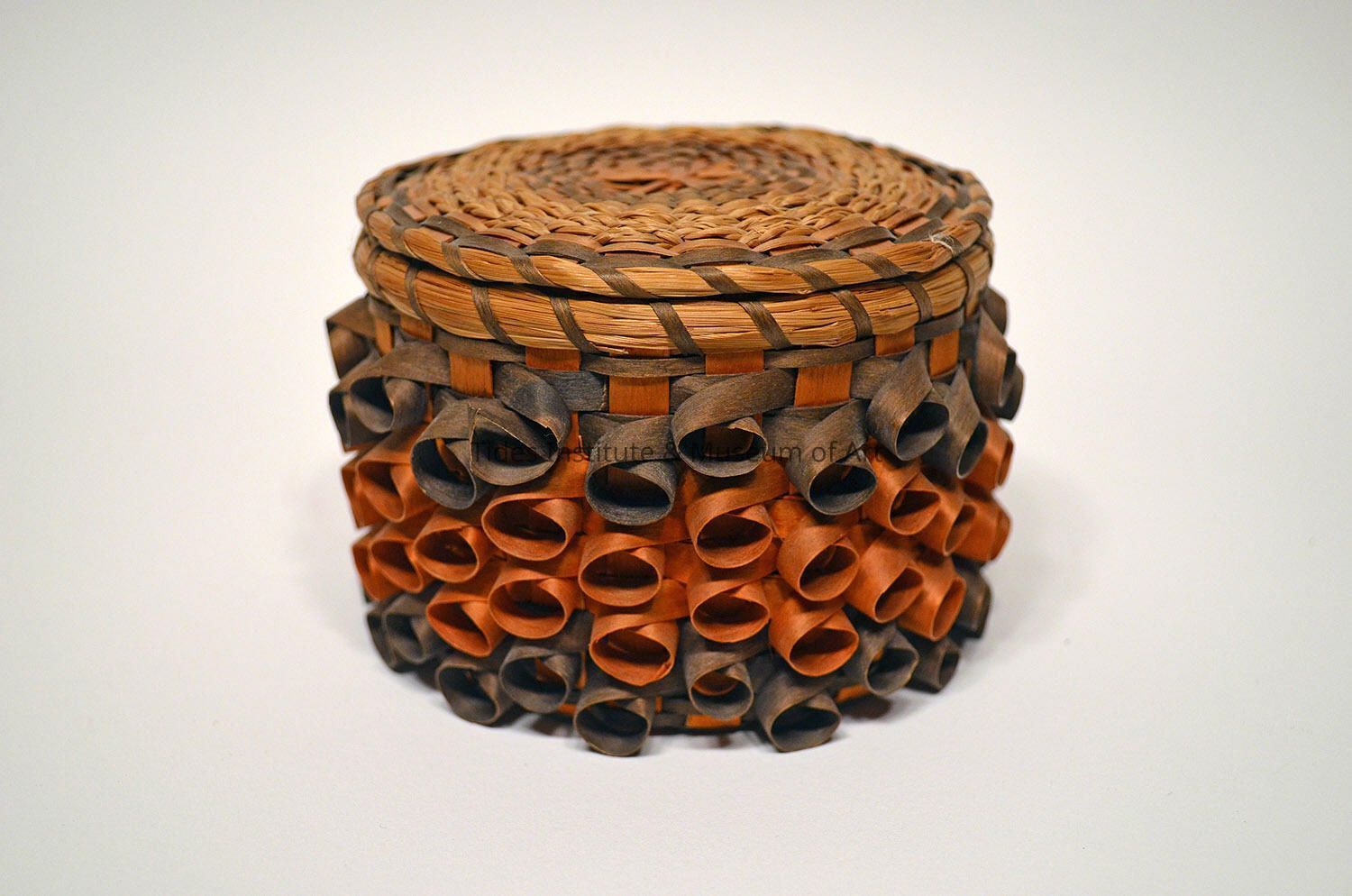 Smallish Orange and Black (Faded) Basket with Lid [Passamaquoddy] | Unkown ArtistDescription