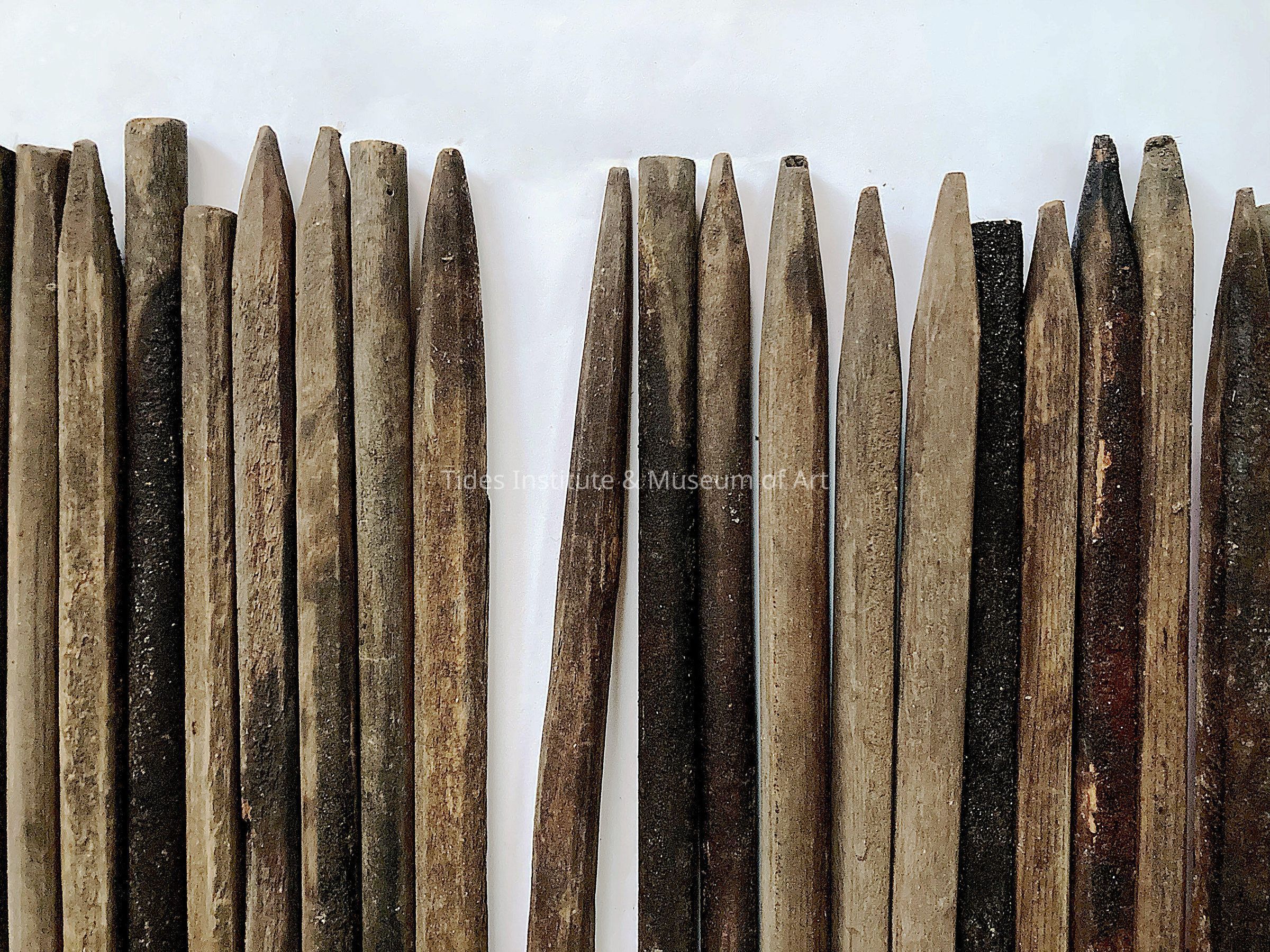 A collection of twenty-nine 20th century wooden smoked herring sticks from the McCurdy herring smoke house complex in Lubec, Maine. During the 19th and for much of the 20th centuries, there were dozens of herring smoke houses throughout the coastal border region between Maine and New Brunswick. Lubec had at least 13 herring smoke houses and Seal Cove on neighboring Grand Manan, New Brunswick had even more. The process of smoking the plentiful herring caught in the surrounding waters and bays was a centuries old process brought to North America from Europe. The half inch in diameter smoked herring sticks, some round, some square, average about 40 inches in length and are sharpened on one end. To this day they retain a pungent smell of smoked herring. The McCurdy complex operated between about 1906 and 1991 on the Lubec waterfront. It is last nearly intact early 20th-century herring smoke house complex in Maine and has been listed on the National Register of Historic Places since 1993. Others still exist in New Brunswick. Once the herring were brought to a herring smoke house operation by boat, they were soaked in a salt brine and then strung on the wooden herring sticks. Sticks full of strung herring were then brought inside nearby smoke houses and suspended in a series of vertical bays above smoldering fires on the building floor. In 1995, four years after the McCurdy herring smoke house operations closed, it was sold to Lubec Landmarks, an organization dedicated to preserving the McCurdy complex and history.
