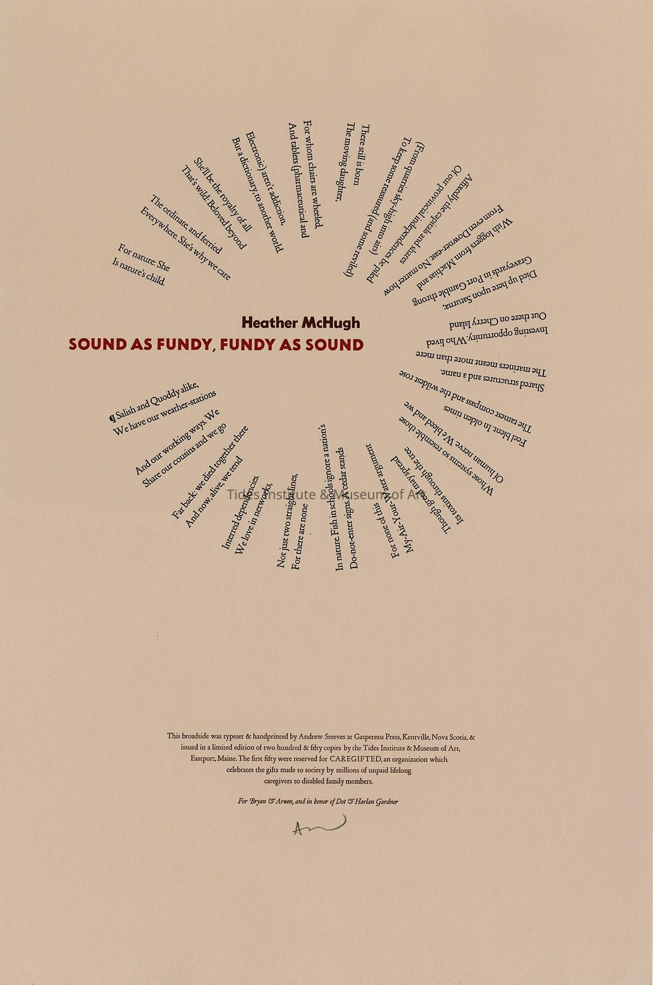 This broadside was typeset & handprinted by Andrew Steeves at Gaspereau Press, Kentville, Nova Scotia, & issued in a limited edition of two hundred & fifty copies by the Tides Institute & Museum of Art, Eastport, Maine. The first fifty were reserved for CAREGIFTED, an organization which celebrates the gifts made to society by millions of unpaid lifelong caregivers to disabled family members. For Bryan & Arwen, and in honor of Dot & Harlan Gardner