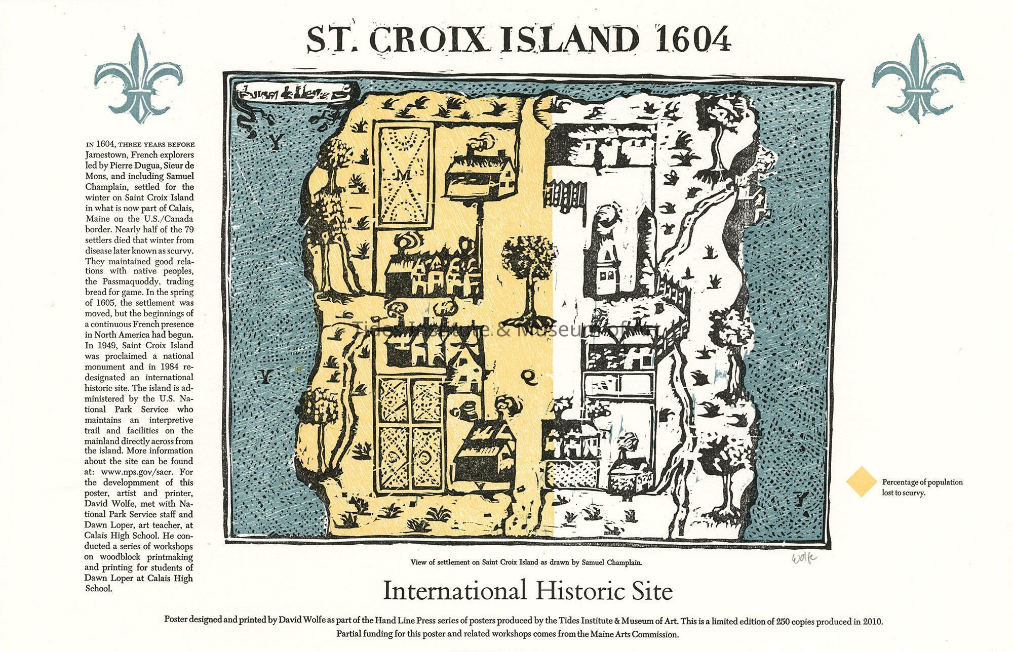 Poster designed and printed by David Wolfe as part of the Hand Line Press series of posters produced by the Tides Institute & Museum of Art. This is a limited edition of 250 copies produced in 2010. Partial funding for this poster and related workshops comes from the Maine Arts Commission.