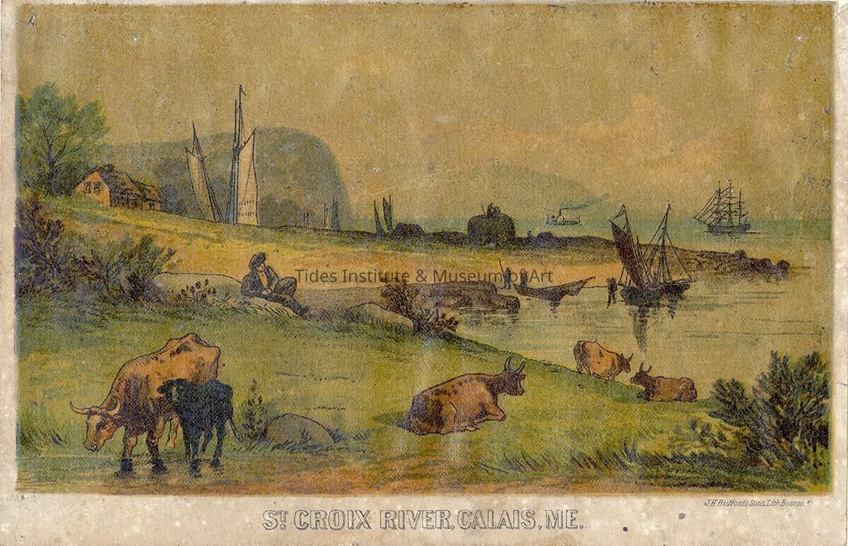 A small late 19th century lithographic print titled “St. Croix River, Calais, Me.” The print is about 4 1/4 inches high and 6 1/2 inches wide. It shows a bucolic scene along the shores of the river separating Maine and New Brunswick with cows, a farm house and farm, sailing vessels, and what appears to be an outcrop of the Devil’s Head landmark in the background. The print is the work of J. H. Bufford's Sons Lithographers of Boston and dates to about 1860. The lithographic form of printing was invented at the end of the 18th century and became a prevalent form of reproducing a wide range of “art” scenes in the first half of the 19th century. John Henry Bufford was part of these greatly expanding lithographic endeavors. Bufford was born in Portsmouth, New Hampshire in 1810. He studied and worked under the well known Pendleton lithography shop in Boston for a few years between 1829 and 1831 while also working on his own. Later he moved to New York City to work as a pictorial artist with the even better known Endicott and Nathaniel Currier lithography shop while continuing, again, to work on his own. He returned to Boston in 1840 and worked for various printing and publishing firms, sometimes in partnership with his brother-in-law, sometimes alone. His businesses thrived until the late 1860s, when photolithography became a widely available, less expensive alternative to the more traditional lithography. Bufford died in Roxbury, Massachusetts in 1870. We located his “St. Croix River, Calais, Me.” print in Pennsylvania. It is the only print of his that we know of set in Washington County, Maine.