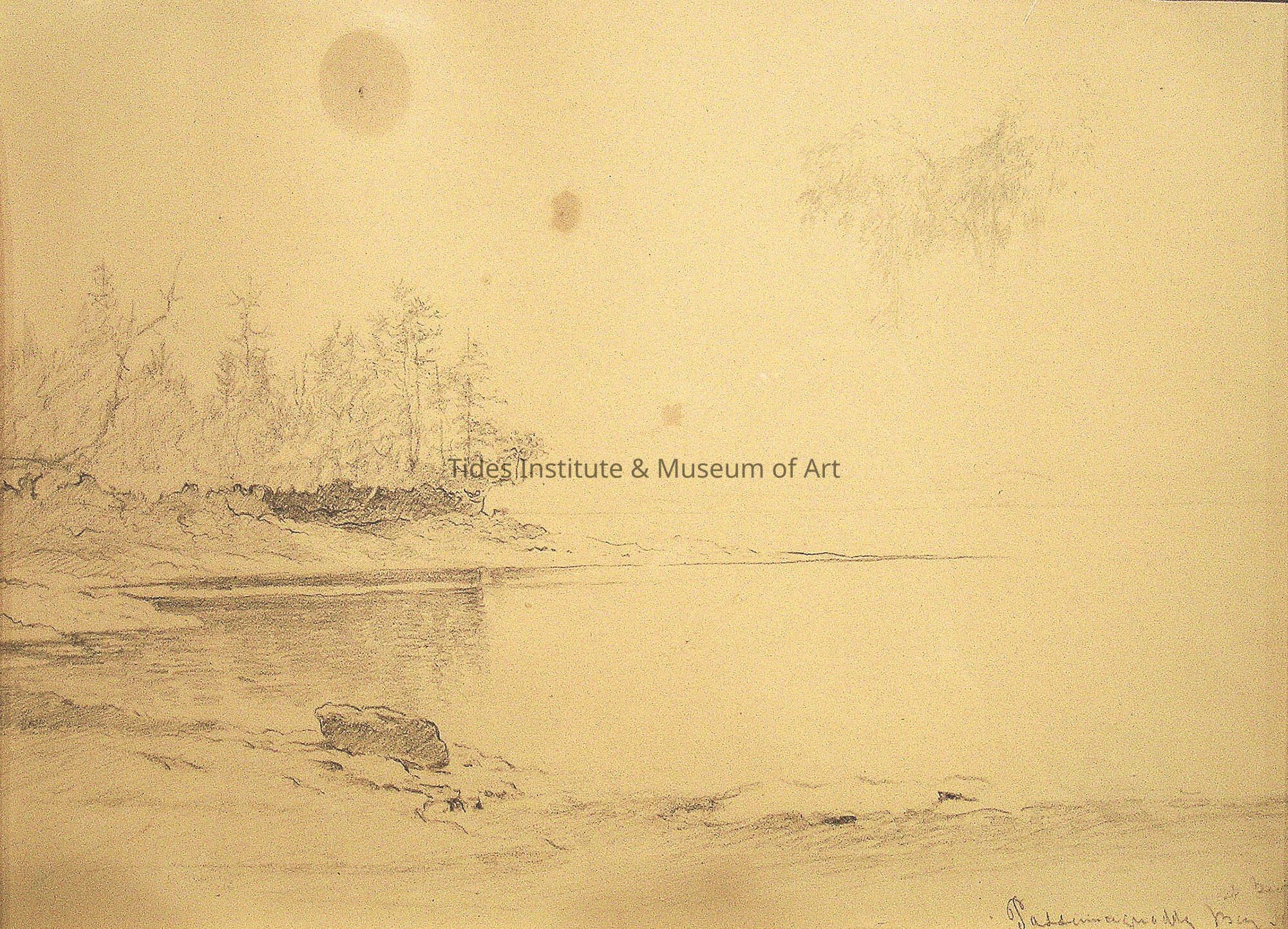 One of two mid-19th century drawings by American artist Martin Johnson Heade of the Passamaquoddy Bay area in the collections of the Tides Institute. Both came from the Spanierman Gallery in New York City, one directly from the gallery and one after the gallery had closed. The drawing shown here shows a shoreline scene near St. George, New Brunswick. It dates to the early 1860s. Heade was born in Lumberville, Pennsylvania in 1819 and developed an interest in art at an early age. His early works from the 1840s were mostly portraits. But soon afterwards, he began to travel to Europe as well as travel within the United States. Some of his early work was exhibited in Philadelphia in 1841 and New York in 1843. Around this time, he became acquainted with the Hudson River School of artists and that led to his interest in landscape painting, an interest that stayed with him through the rest of his life. He became attracted to the Maine coast and it was fairly easy to come to this coast even more remote parts of it like Eastport and Passamaquoddy Bay by way of existing regularly scheduled steamship service from Boston. In addition to several drawings that he did while in the Passamaquoddy Bay region, Heade also did at least one large painting. Heade is best known for his landscape paintings of New England salt marshes and coastal views as well as detailed scenes of tropical birds and flower blossoms. In 1883, Heade married and moved to St. Augustine, Florida. Henceforth this paintings focused on Florida landscapes and flowers, particularly magnolias. He died in 1904. His paintings are now found in the collections of major art museums throughout the United States.