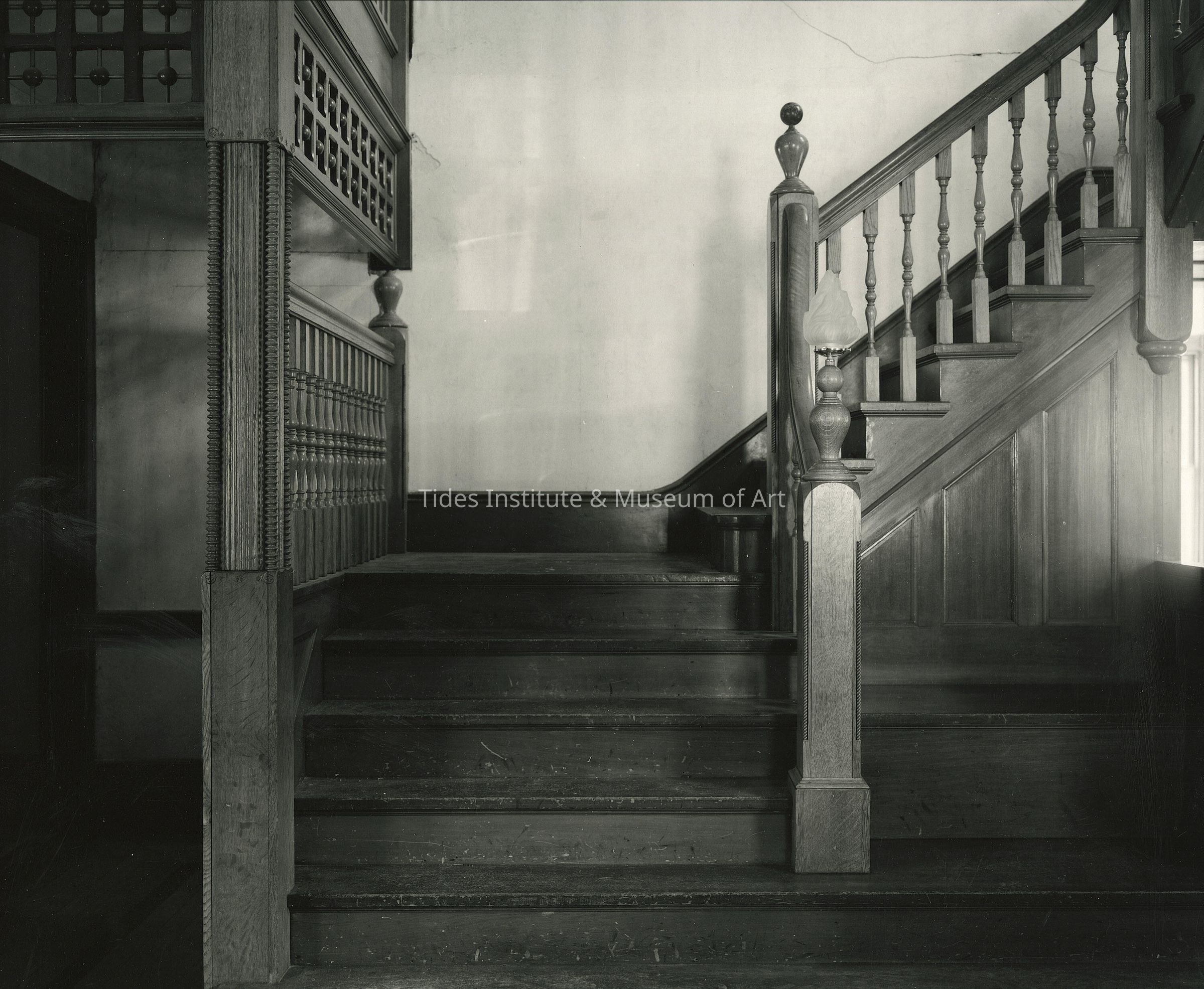 A gelatin silver photographic print, “Staircase, Capen House, 16 Key Street, Eastport, Maine,” by photographer, Thaddeus Holownia, taken in 2015. The photograph was part of a large scale nine year effort by Holownia to photograph the architecture, landscape and community of Eastport, Maine from 2009 to 2017. Using large format cameras and film photography, Holownia took nearly 1,000 photographs of building exteriors and interiors, architectural details and wider streetscapes and landscapes of Eastport. Nearly 200 of the photographs were incorporated into the 218 page hardbound book, Eastport, with accompanying thematic essays by New Brunswick architect, John Leroux, co-published by Holownia’s Anchorage Press and the Tides Institute & Museum of Art (TIMA) in 2018. Holownia was born in England in 1949 and immigrated to Canada in 1954. For 41 years he taught photography at Mount Allison University in Sackville New Brunswick. Holownia’s exquisite large format photographs of the forests, rivers and architecture of Atlantic Canada and other selective parts of the world have been exhibited and published extensively including a major retrospective exhibition of his work, The Nature of Nature, The Photographs of Thaddeus Holownia 1976–2016, at the Art Gallery of Nova Scotia in 2017. Holownia is a Fellow of the Royal Society of Canada and he received the Lieutenant Governor’s Award for High Achievement in the Visual Arts from artsNB as well as the Order of New Brunswick. The Eastport photograph was a gift to TIMA by the photographer.