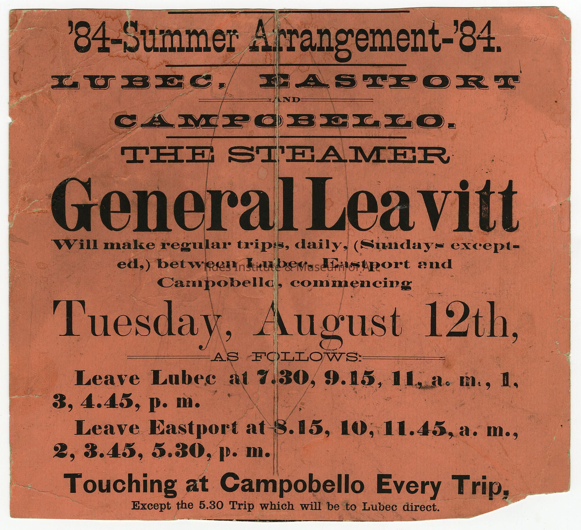 Steamer General Leavitt | Summer Schedule | Hand Bill | 1884