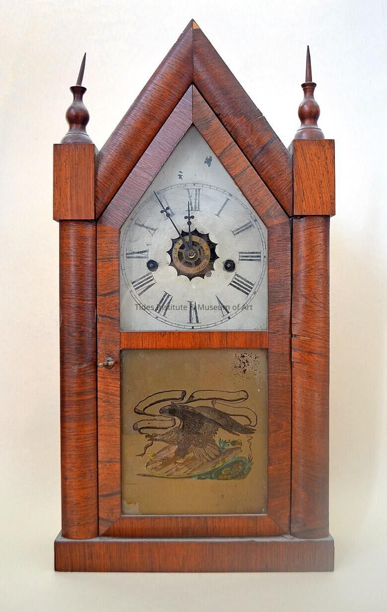 Steeple Clock, c.1870s. Waterbury Clock Company, Waterbury, Connecticut. Clock is originally from the Wells-Shober Cottage, Campobello, New Brunswick. From the Emery family Elm Cottage, Elm Street, Eastport, Maine. Her father had once purchased the Wells-Shober Cottage including contents. Joyce tells of her father and brother bringing a truckload of furniture from the Cottage over to Eastport.