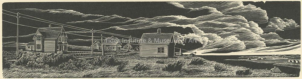 These two examples show the iterative process of relief printmaking. While viewers often see the final version of a print, printmakers can rework and edit their initial compositions many times before they settle on a final print. For example, in Storm Over Nova Scotia, Inman initially wanted to depict the wooden clapboard details of the homes along the coast. However, after printing this version and reflecting on the composition, Inman chose to go back into the woodblock and remove this detail. Each version of this block produces a different effect. While the first block conveyed a sense of darkness of the oncoming storm, the second block reflects a dichotomy that is often present in summer thunderstorms–pounding rain from shadowy clouds, with bright sunlight appearing in the distance.